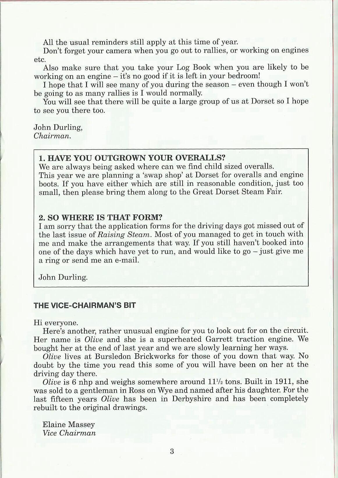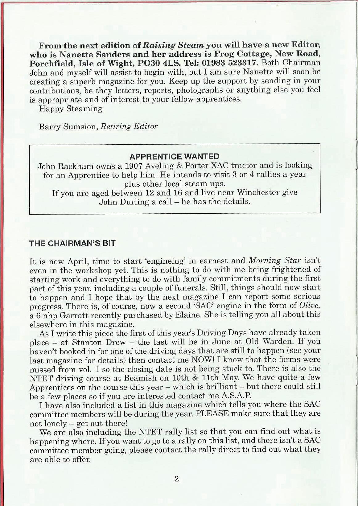 From the next edition of Raising Steam you will have a new Editor, who is Nanette Sanders and her address is Frog Cottage, New Road, Porchfield, Isle of Wight, PO30 4LS. Tel: 01983 523317. Both Chairman John and myself will assist to begin with, but I am sure Nanette will soon be creating a superb magazine for you. Keep up the support by sending in your contributions, be they letters, reports, photographs or anything else you feel is appropriate and of interest to your fellow apprentices.