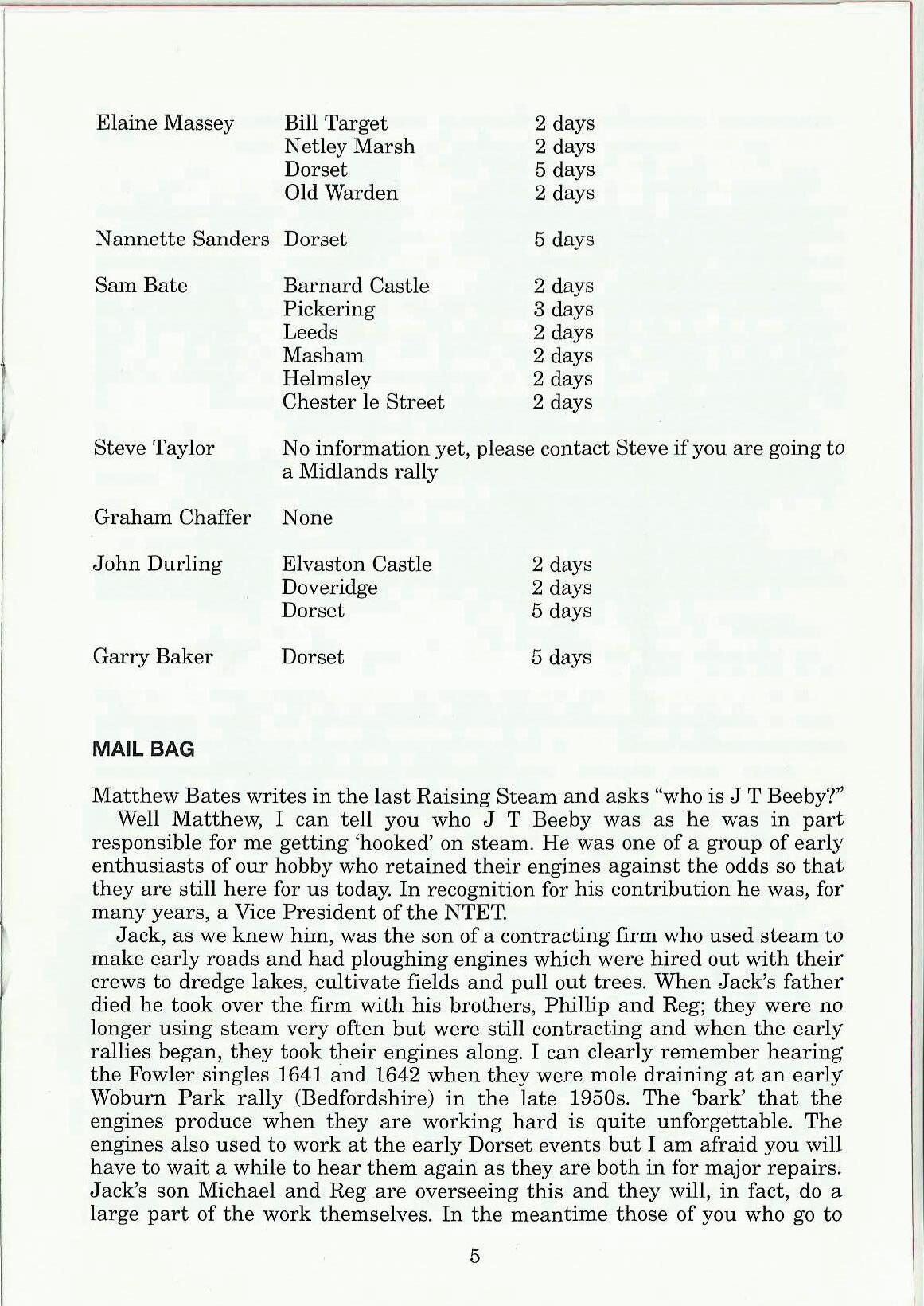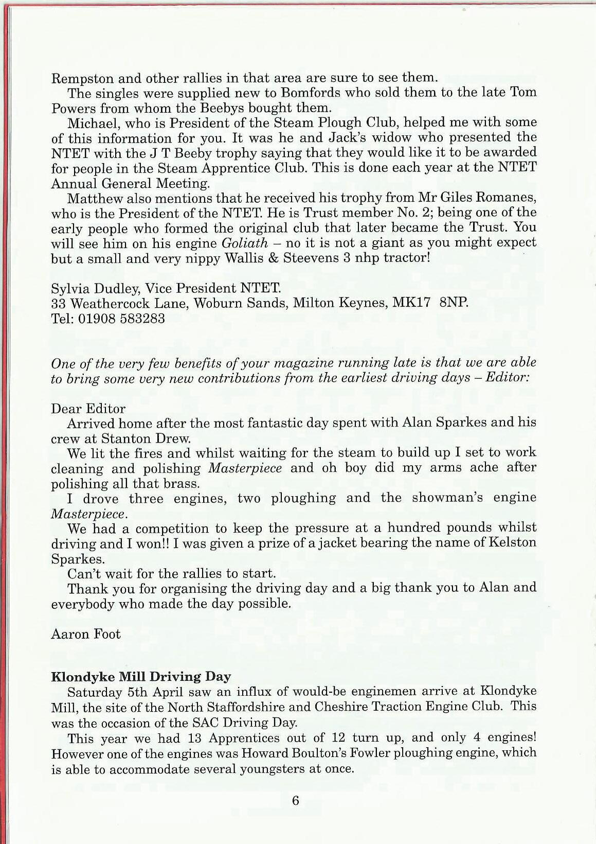 Michael, who is President of the Steam Plough Club, helped me with some of this information for you. It was he and Jack's widow who presented the NTET with the J T Beeby trophy saying that they would like it to be awarded for people in the Steam Apprentice Club. This is done each year at the NTET Annual General Meeting.