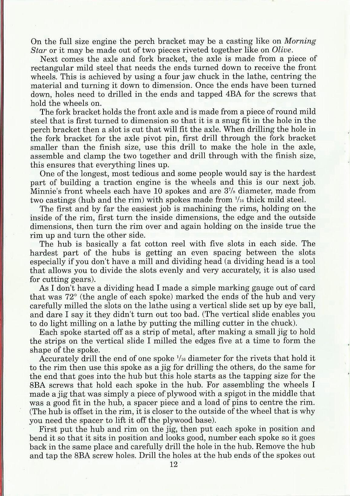 to 8BA clearance, then countersink the outside of the hole in each spoke and screw the spokes in position (I use Araldite to lock the screws in place and to help to hold the spokes). Put the hub back in the jig with the rim and do the same to the other side, remember to put the rim in position when you screw the other spokes in or you won't get it in! Now you should have a wheel with a loose rim. With it still in the jig, drill one of the holes in each spoke through the rim and place a rivet in it to hold it in position, now you can remove the wheel from the jig and peen the rivets over. Do the same to the other side then drill and rivet the remaining holes. (If your jig is accurate enough you should end up with a perfect wheel).