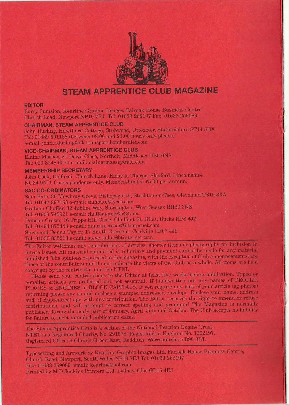 The Steam Apprentice Club is a section of the National Traction Engine 'rrtlfit. NTET is a Registured Charity, No. 291578. Registered in England No. 1302197. Registered Office: 4 Cbl.ll·chGreen East, Re<l<litch,Worcestershire B98 8B'l'.