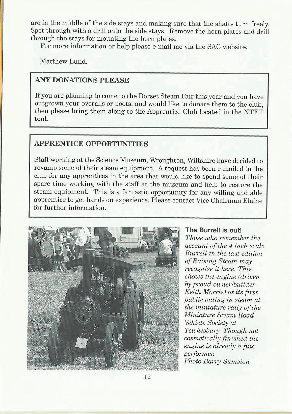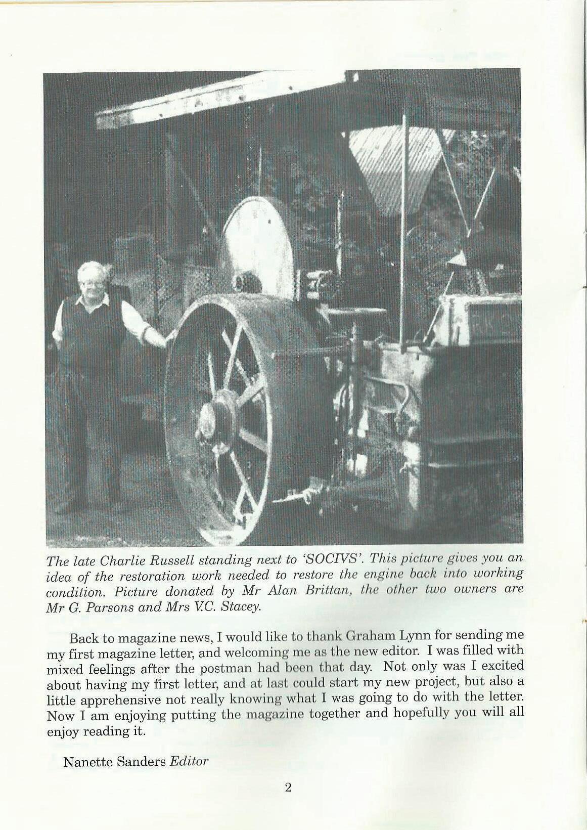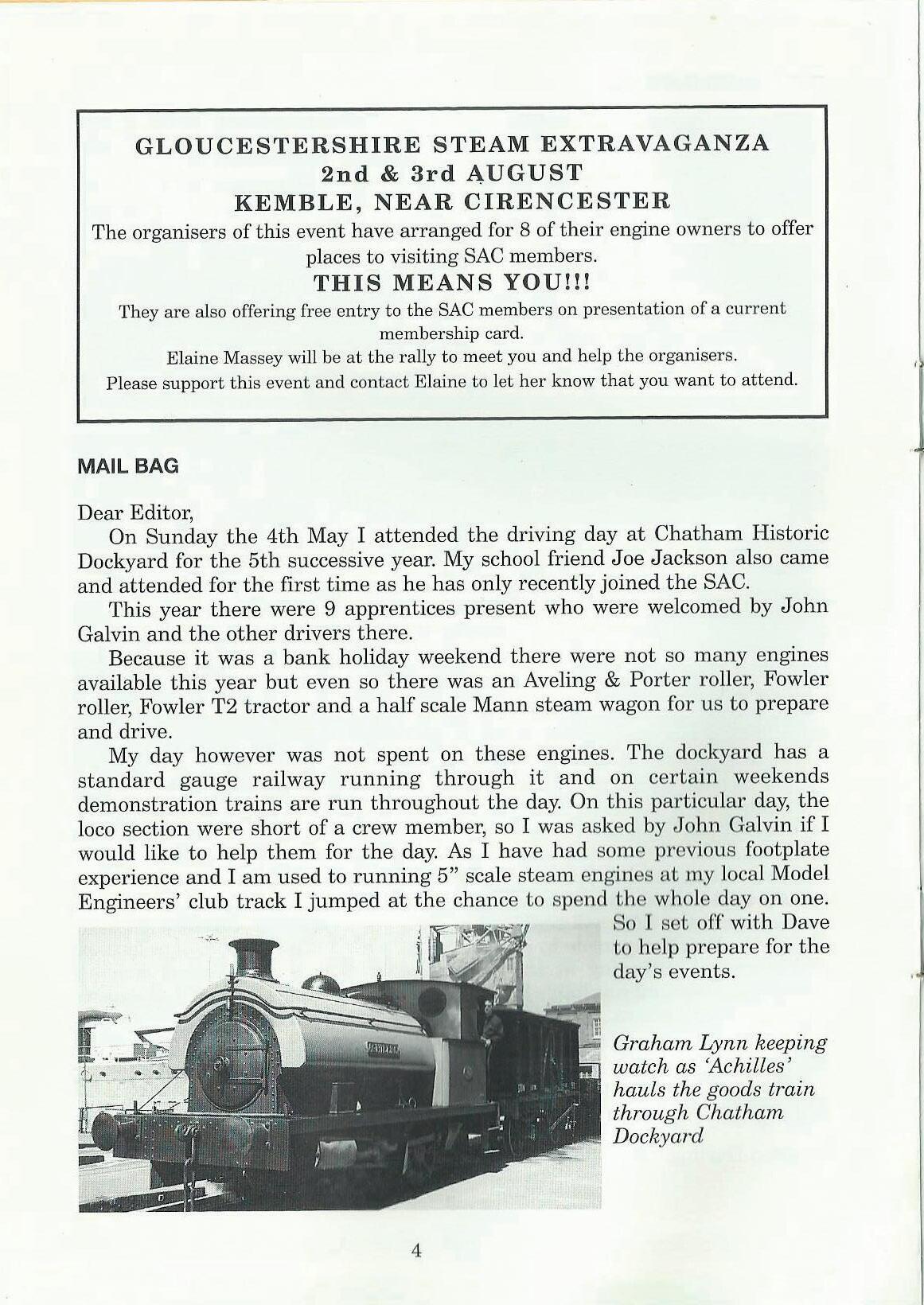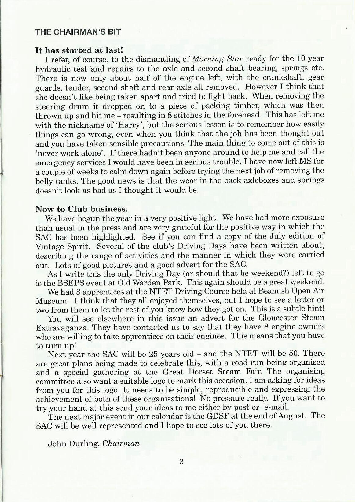 We have begun the year in a very positive light. We have had more exposure than usual in the press and are very grateful for the positive way in which the SAC has been highlighted. See if you can find a copy of the July edition of Vintage Spirit. Several of the club's Driving Days have been written about, describing the range of activities and the manner in which they were carried out. Lots of good pictures and a good advert for the SAC. As I write this the only Driving Day (or should that be weekend?) left to go is the BSEPS event at Old Warden Park. This again should be a great weekend. We had 8 apprentices at the NTET Driving Course held at Beamish Open Air Museum. I think that they all enjoyed themselves, but I hope to see a letter or two from them to let the rest of you know how they got on. This is a subtle hint!
