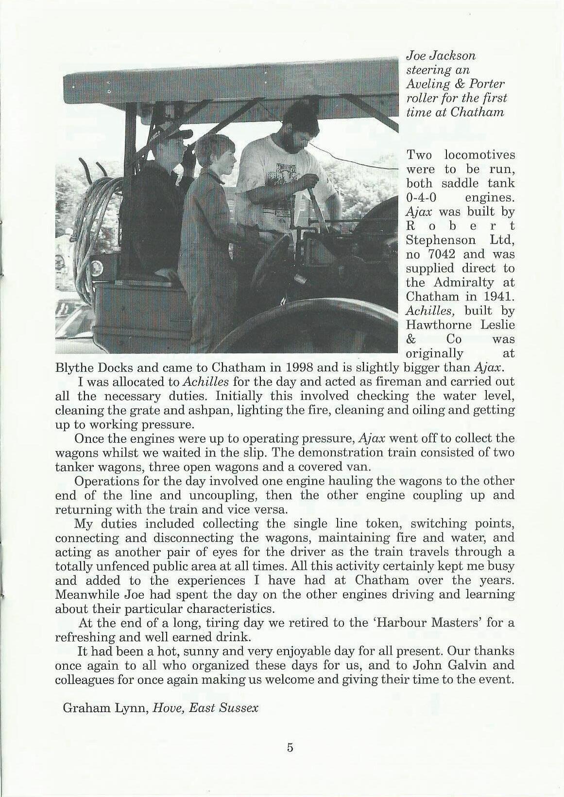 Blythe Docks and came to Chatham in 1998 and is slightly bigger than Ajax. I was allocated to Achilles for the day and acted as fireman and carried out all the necessary duties. Initially this involved checking the water level, cleaning the grate and ashpan, lighting the fire, cleaning and oiling and getting up to working pressure.
