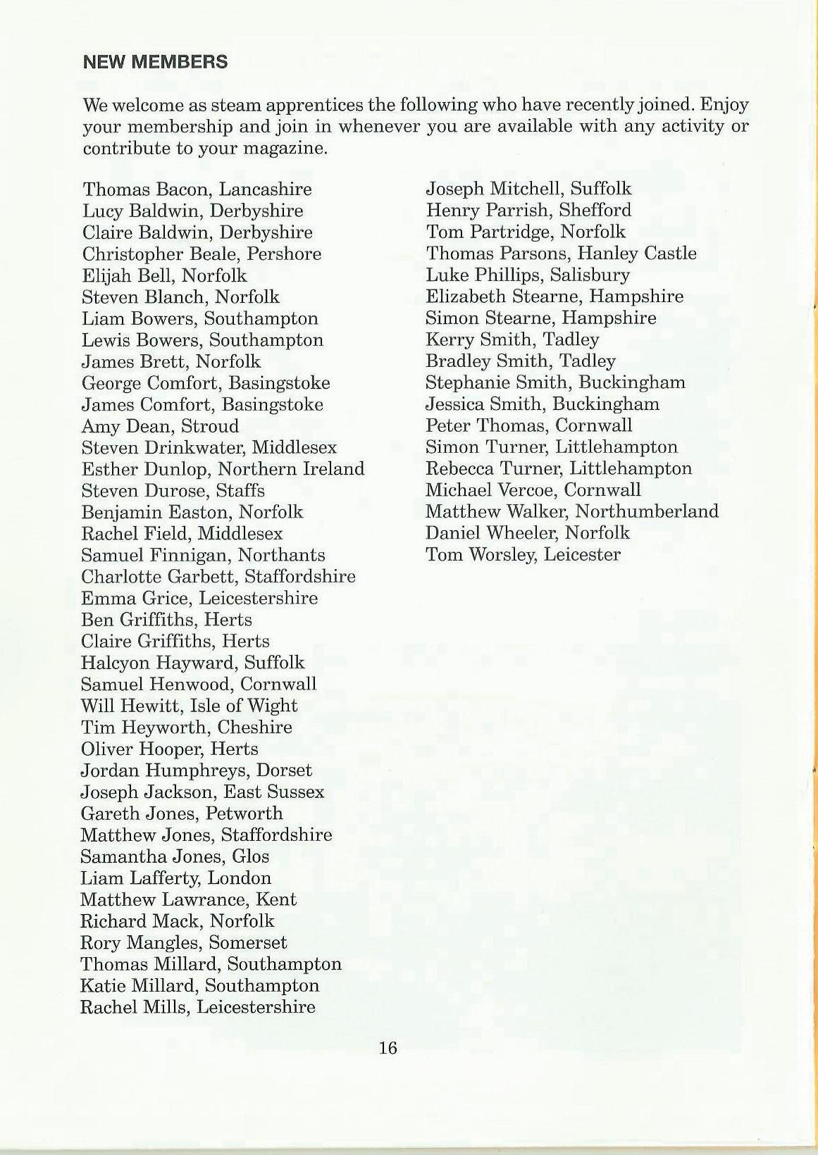 We welcome as steam apprentices the following who have recently joined. Enjoy your n1embership and join in whenever you are available with any activity or contribute to your magazine.