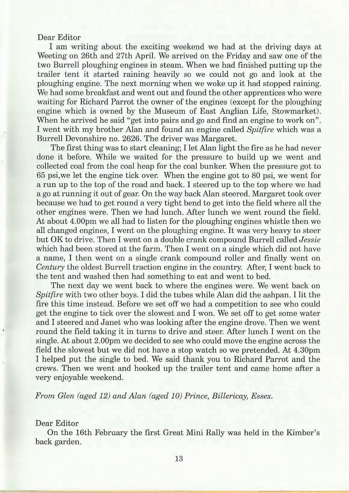 I am writing about the exciting weekend we had at the driving days at Weeting on 26th and 27th April. We arrived on the Friday and saw one of the two Burrell ploughing engines in steam. When we had finished putting up the trailer tent it started raining heavily so we could not go and look at the ploughing engine. The next morning when we woke up it had stopped raining. We had some breakfast and went out and found the other apprentices who were waiting for Richard Parrot the owner of the engines (except for the ploughing engine which is owned by the Museum of East Anglian Life, Stowmarket), When he arrived he said "get into pairs and go and find an engine to work on". I went with my brother Alan and found an engine called Spitfire which was a Burrell Devonshire no. 2626. The driver was Margaret.
