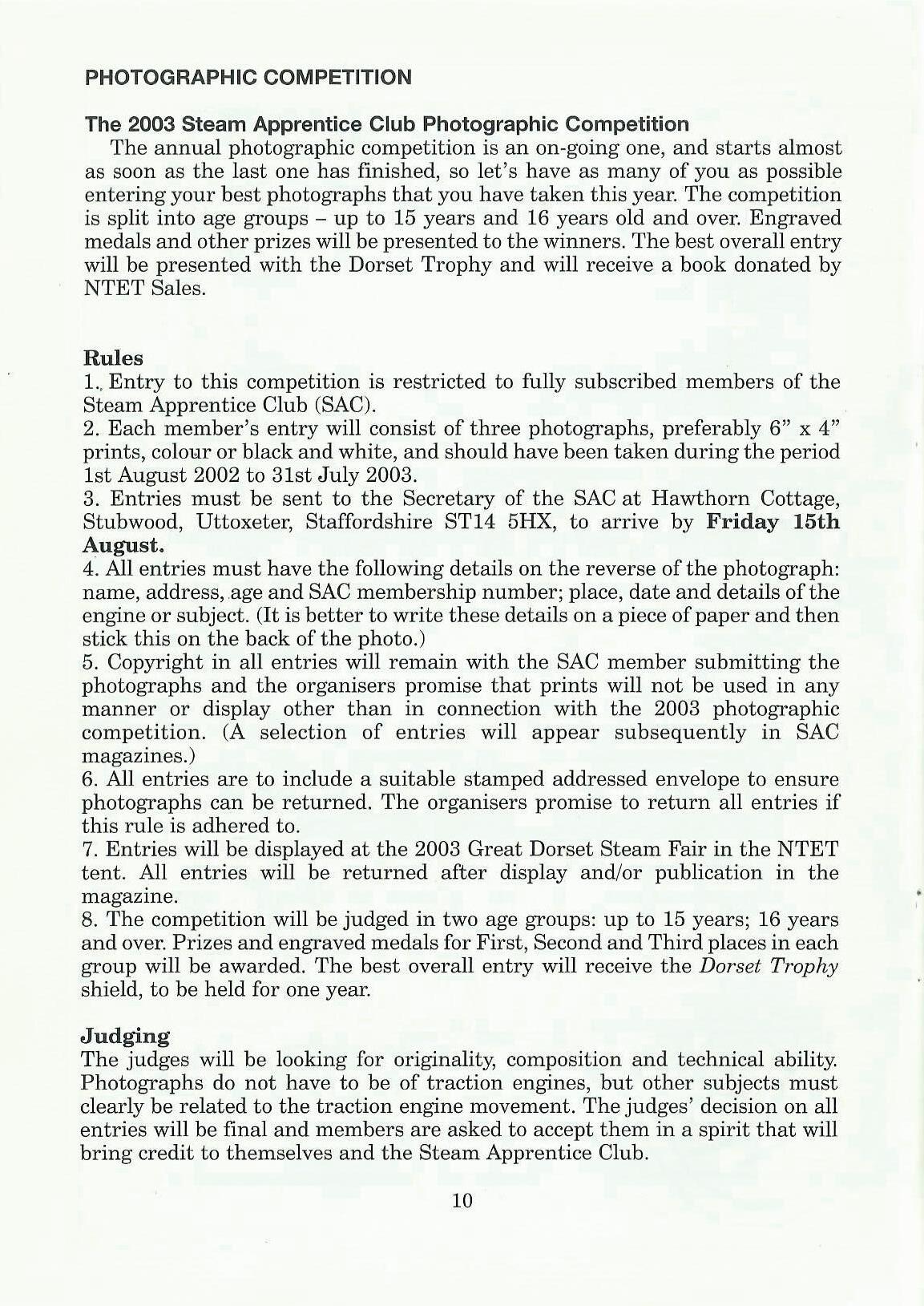 7. Entries will be displayed at the 2003 Great Dorset Steam Fair in the NTET tent. All entries will be returned after display and/or publication in the magazine.