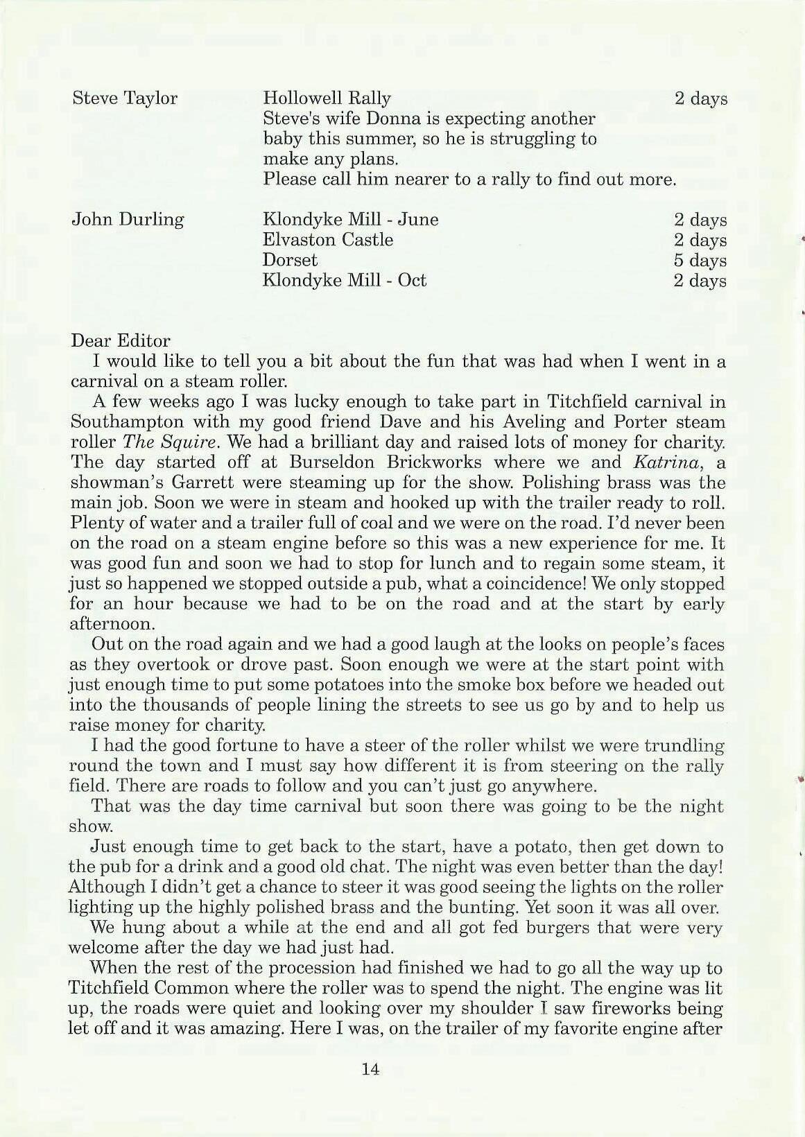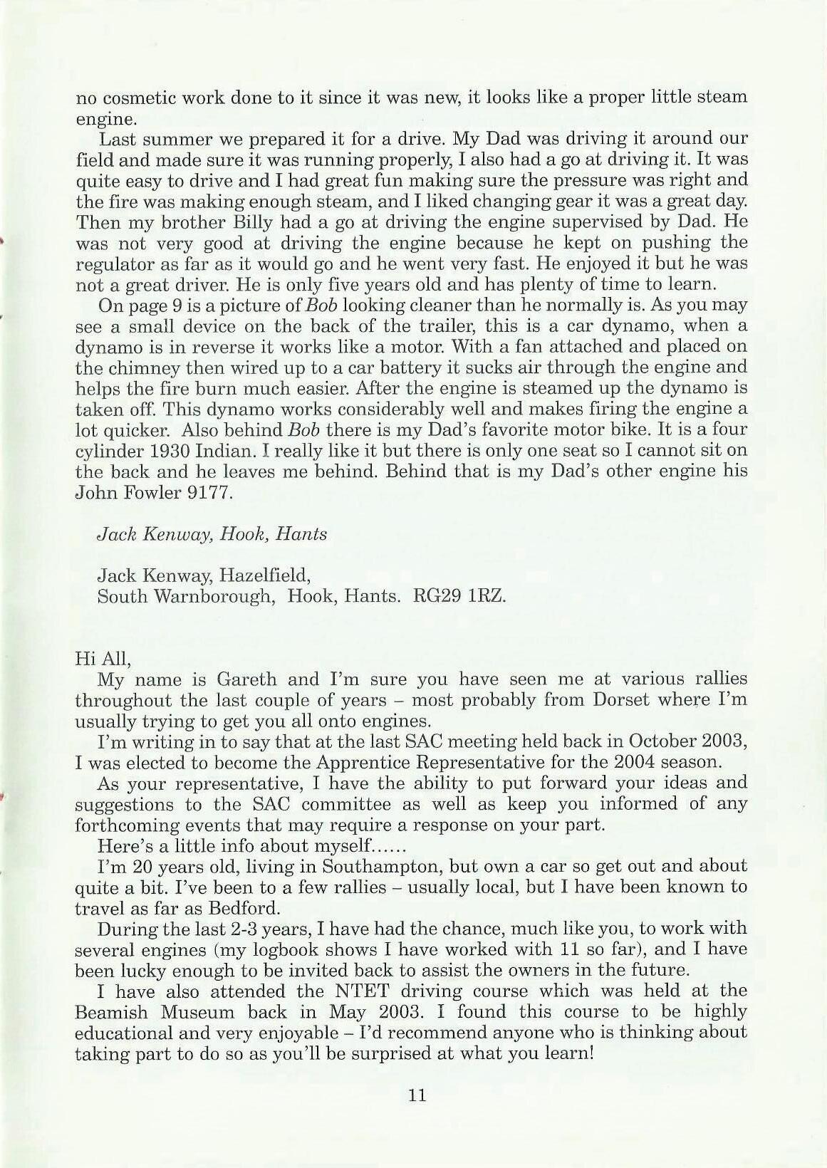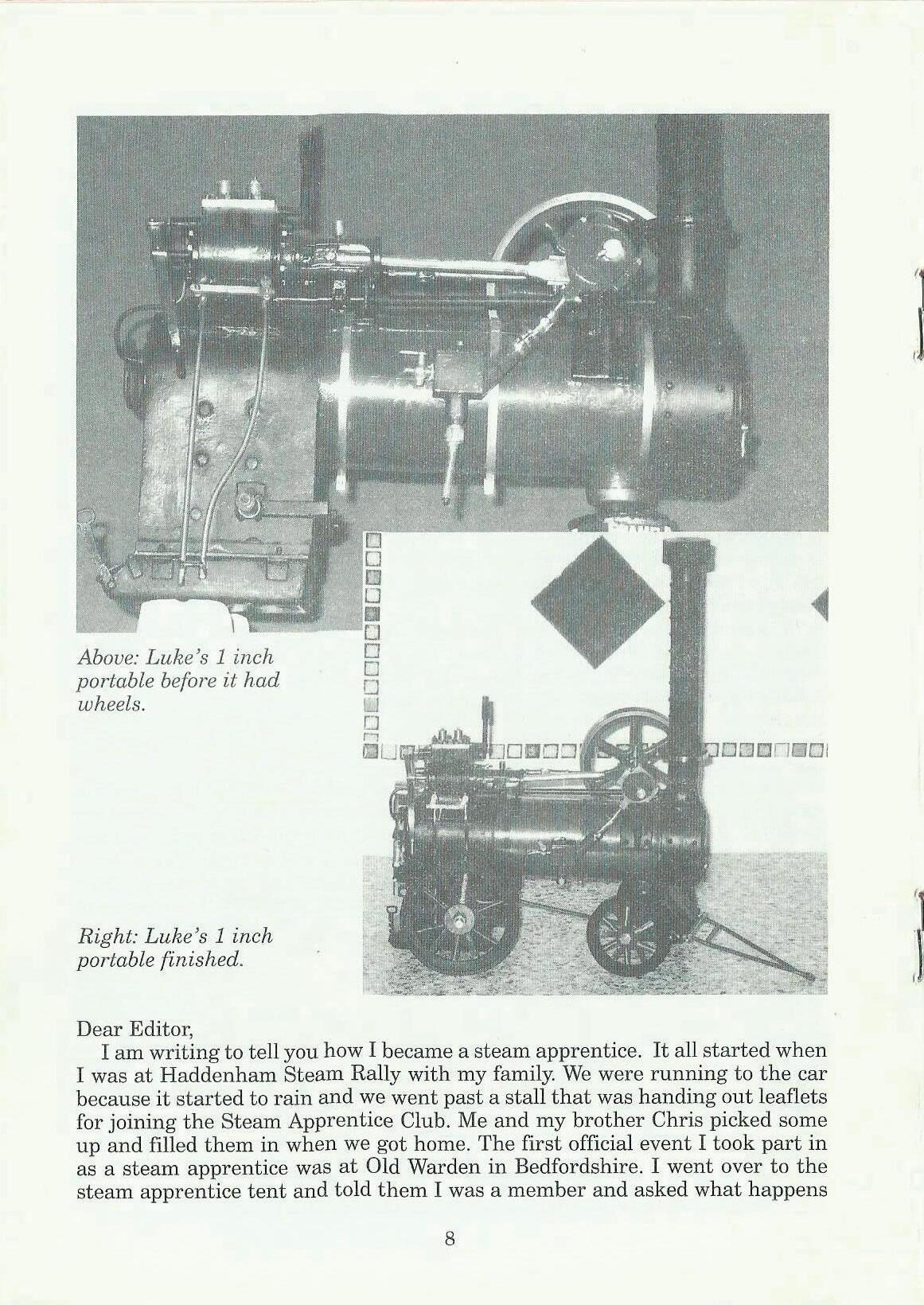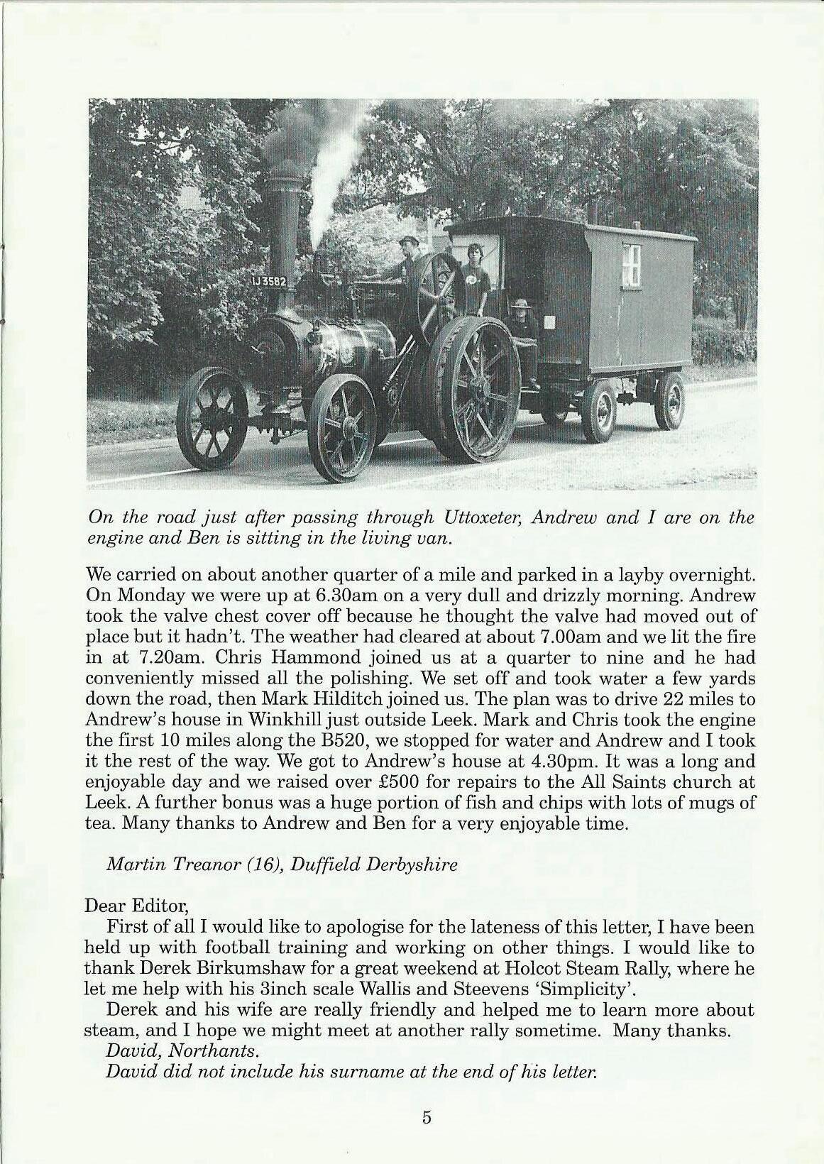 First of all I would like to apologise for the lateness of this letter, I have been held up with football training and working on other things. I would like to thank Derek Birkumshaw for a great weekend at Holcot Steam Rally, where he let me help with his 3inch scale Wallis and Steevens 'Simplicity'.