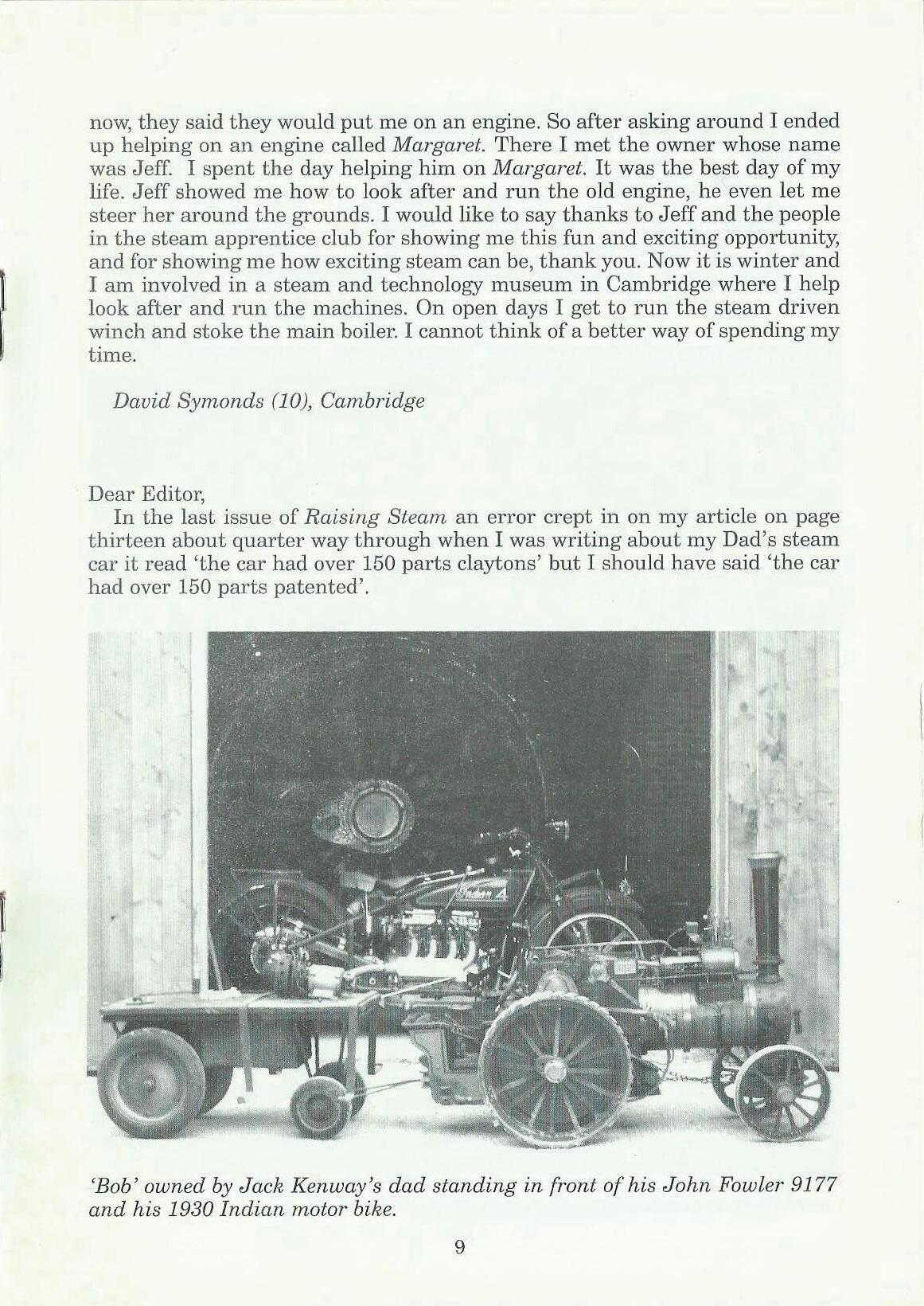 In the last issue of Raising Steam an error crept in on my article on page thirteen about quarter way through when I was writing about my Dad's steam car it read 'the car had over 150 paTts claytons' but I should have said 'the car had over 150 parts patented'.