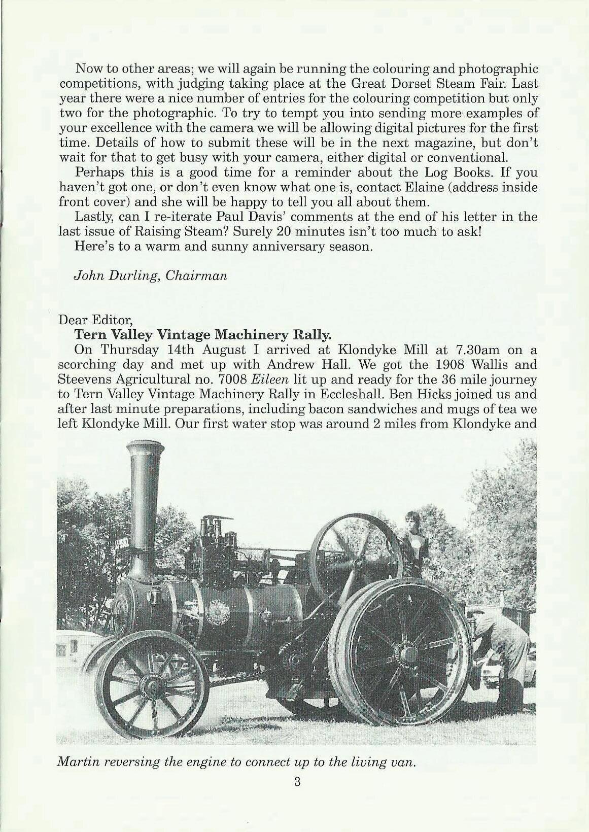 Now to other areas; we will again be running the colouring and photographic competitions, with judging taking place at the Great Dorset Steam Fair. Last year there were a nice number of entries for the colouring competition but only two for the photographic. To try to tempt you into sending more· examples of your excellence with the camera we will be allowing digital pictures for the first tilne. Details of how to submit these will be in the next magazine, but don't wait for that to get busy with your camera, either digital or conventional.