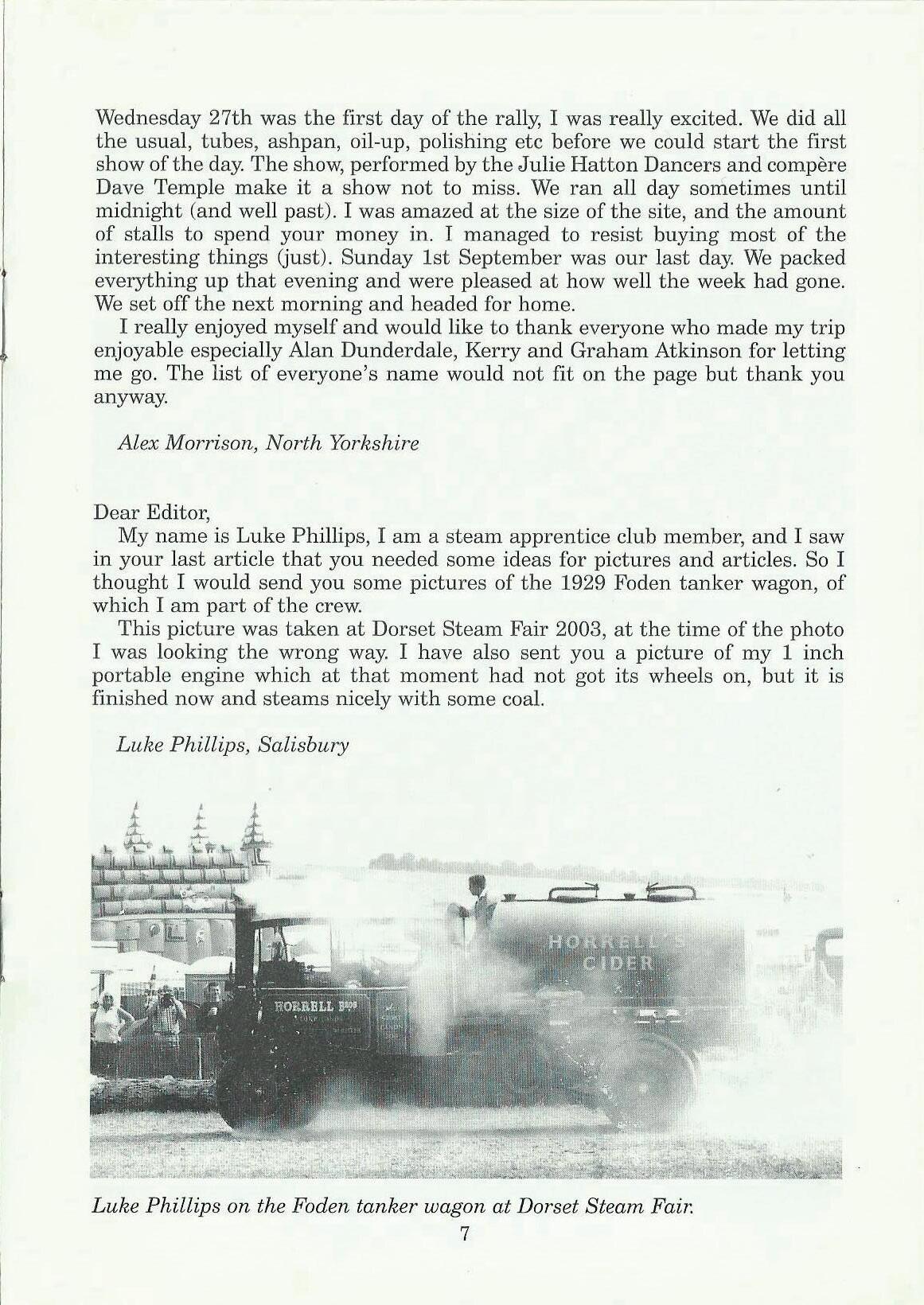 My name is Luke Phillips, I am a steam apprentice club member, and I saw in your last article that you needed some ideas for pictures and articles. So I thought I would send you some pictures of the 1929 Foden tanker wagon, of which I am part of the crew.
