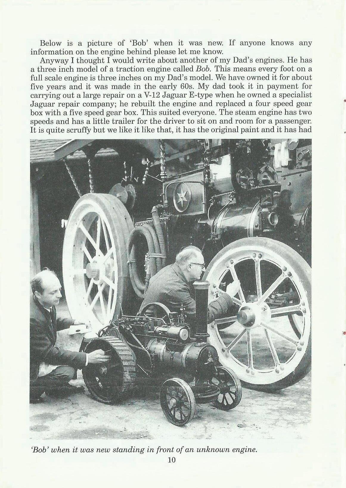 On page 9 is a picture of Bob looking cleaner than he normally is. As you may see a small device on the back of the trailer, this is a car dynamo, when a dynamo is in reverse it works like a motor. With a fan attached and placed on the chimney then wired up to a car battery it sucks air through the engine and helps the fire burn much easier. After the engine is steamed up the dynamo is taken off. This dynamo works considerably well and makes firing the engine a lot quicker. Also behind Bob there is my Dad's favorite motor bike. It is a four cylinder 1930 Indian. I really like it but there is only one seat so I cannot sit on the back and he leaves me behind. Behind that is my Dad's other engine his John Fowler 9177.