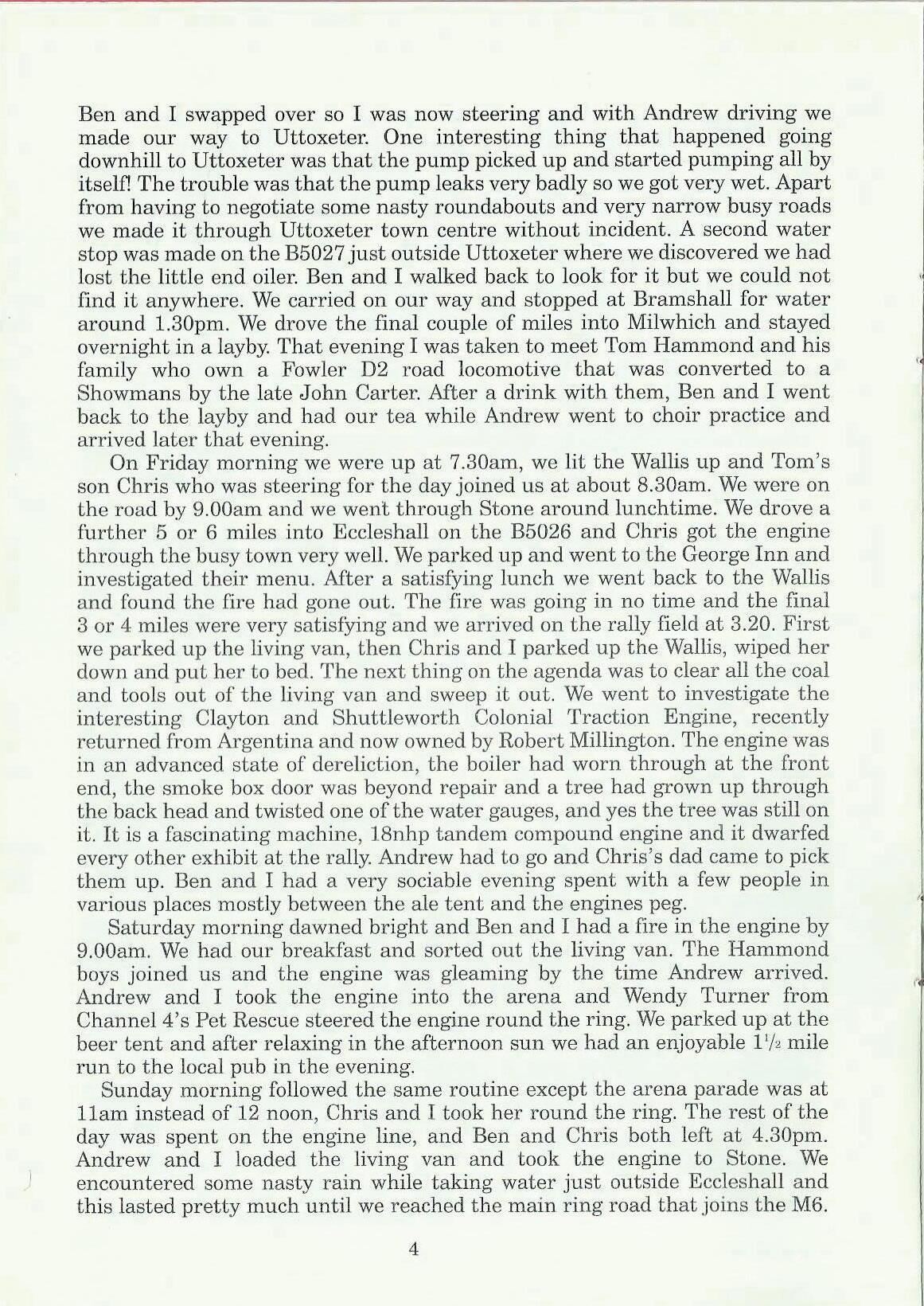 Saturday morning dawned bright and Ben and I had a fire in the engine by 9.00am. vVe had our breakfast and sorted out the living van. The Hammond boys joined us and the engine was gleaming by the time Andrew arrived. Andrew and I took the engine into the arena and Wendy Turner from Channel 4's Pet Rescue steered the engine round the ring. We parked up at the beer tent and after relaxing in the afternoon sun we had an enjoyable l 1/2 mile run to the local pub in the evening.
