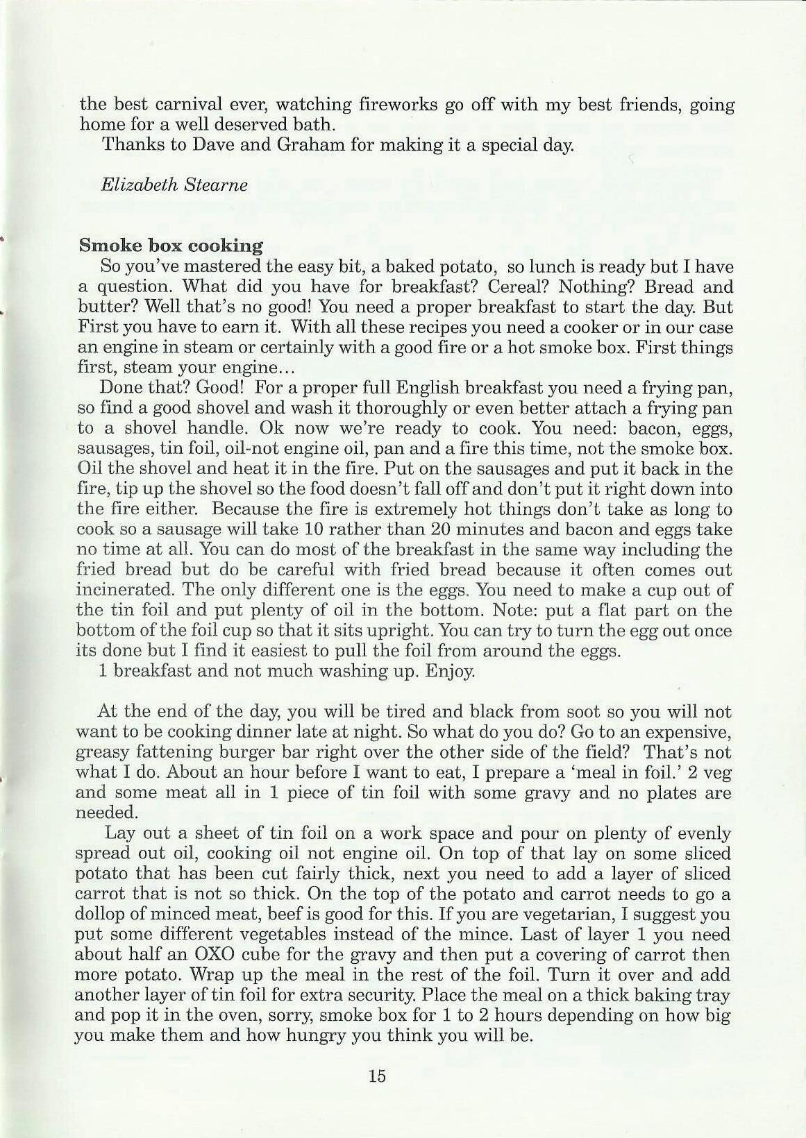 Done that? Good! For a proper full English breakfast you need a frying pan, so find a good shovel and wash it thoroughly or even better attach a frying pan to a shovel handle. Ok now we're ready to cook. You need: bacon, eggs, sausages, tin foil, oil-not engine oil, pan and a fire this time, not the smoke box. Oil the shovel and heat it in the fire. Put on the sausages and put it back in the fire, tip up the shovel so the food doesn't fall off and don't put it right down into the fire either. Because the fire is extremely hot things don't take as long to cook so a sausage will take 10 rather than 20 minutes and bacon and eggs take no time at all. You can do most of the breakfast in the same way including the fried bread but do be careful with fried bread because it often comes out incinerated. The only different one is the eggs. You need to make a cup out of the tin foil and put plenty of oil in the bottom. Note: put a flat part on the bottom of the foil cup so that it sits upright. You can try to turn the egg out once its done but I find it easiest to pull the foil from around the eggs. 1 breakfast and not much washing up. Enjoy.