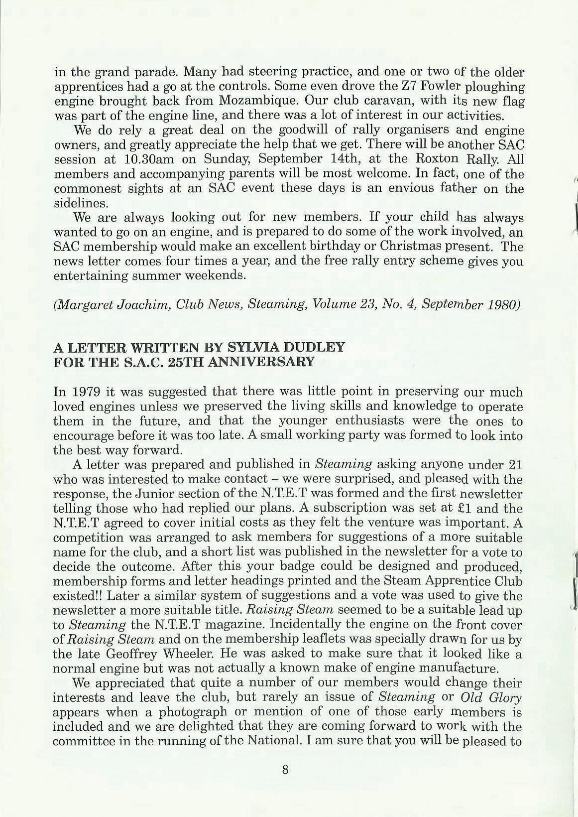 A letter was prepared and published in Steam,ing asking anyone under 21 who was interested to make contact - we were surprised, and pleased with the response, the Junior section of the N.T.E.T was formed and the first newsletter telling those who had replied our plans. A subscription was set at £1 and the N.T.E.T agreed to cover initial costs as they felt the venture was important. A competition was arranged to ask members for suggestions of a more suitable name for the club, and a short list was published in the newsletter for a vote to 1 decide the outcome. After this your badge could be designed and produced, membership forms and letter headings printed and the Steam Apprentice Club l existed!! Later a similar system of suggestions and a vote was used to give the , newsletter a more suitable title. Raising Steam seemed to be a suitable lead up to Steaming the N.T.E.T magazine. Incidentally the engine on the front cover of Raising Steam and on the membership leaflets was specially drawn for us by the late Geoffrey Wheeler. He was asked to make sure that it looked like a normal engine but was not actually a known make of engine manufacture.