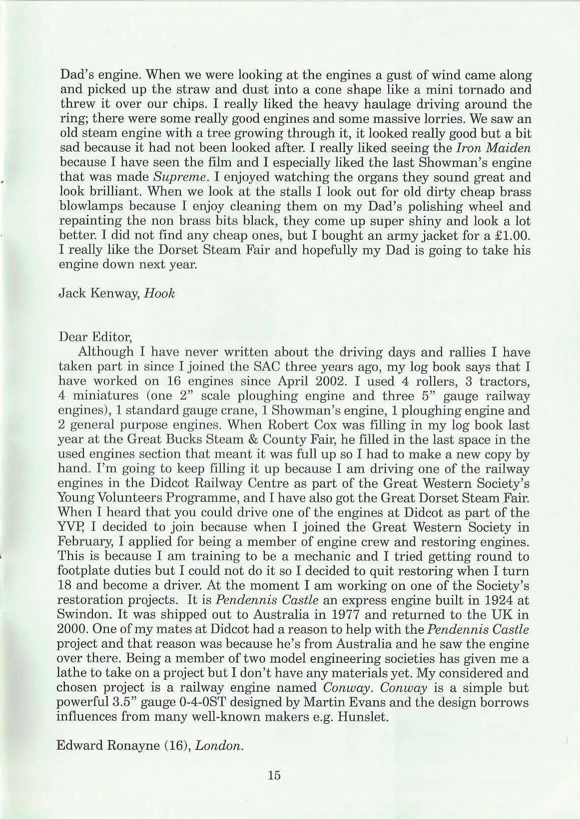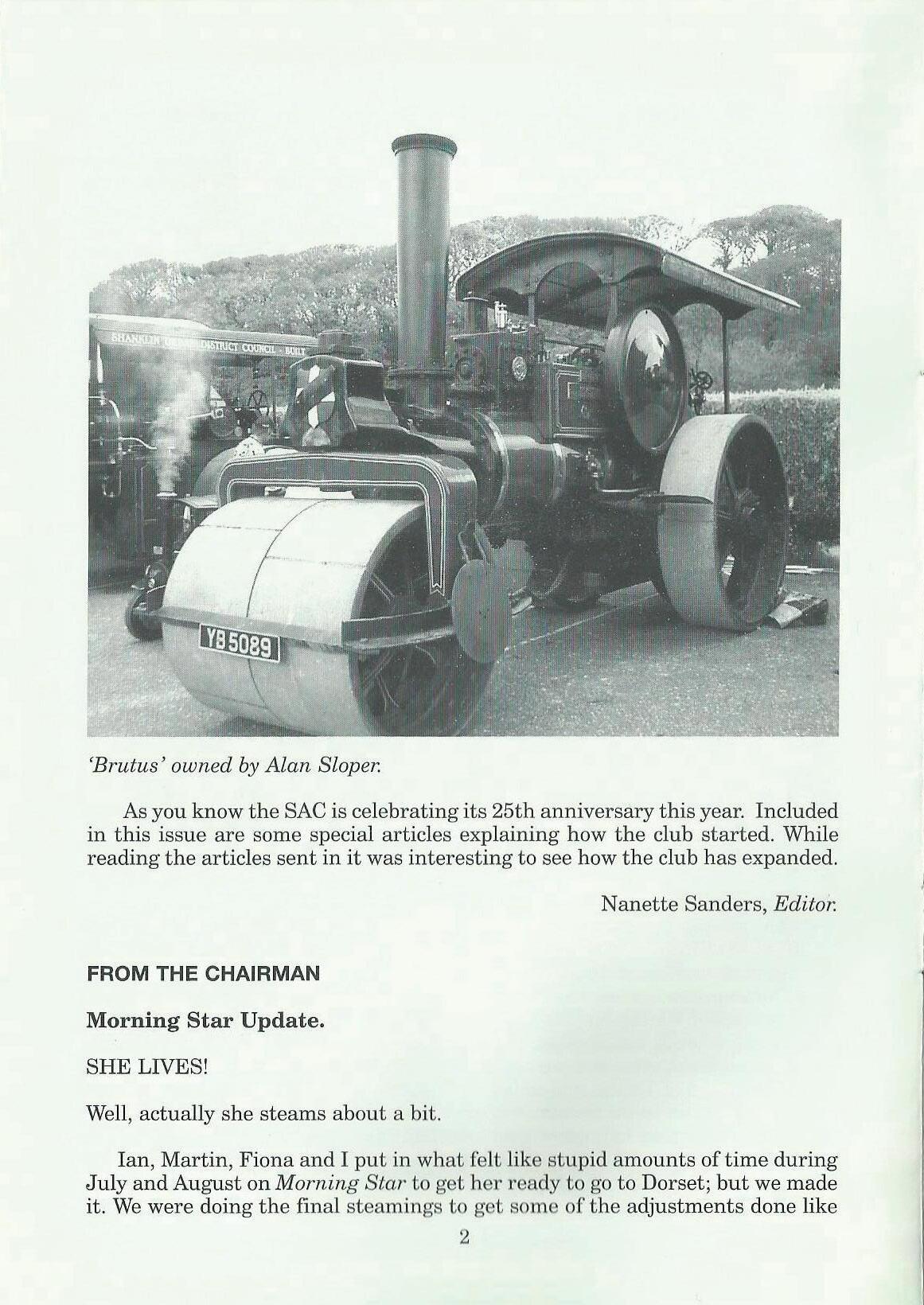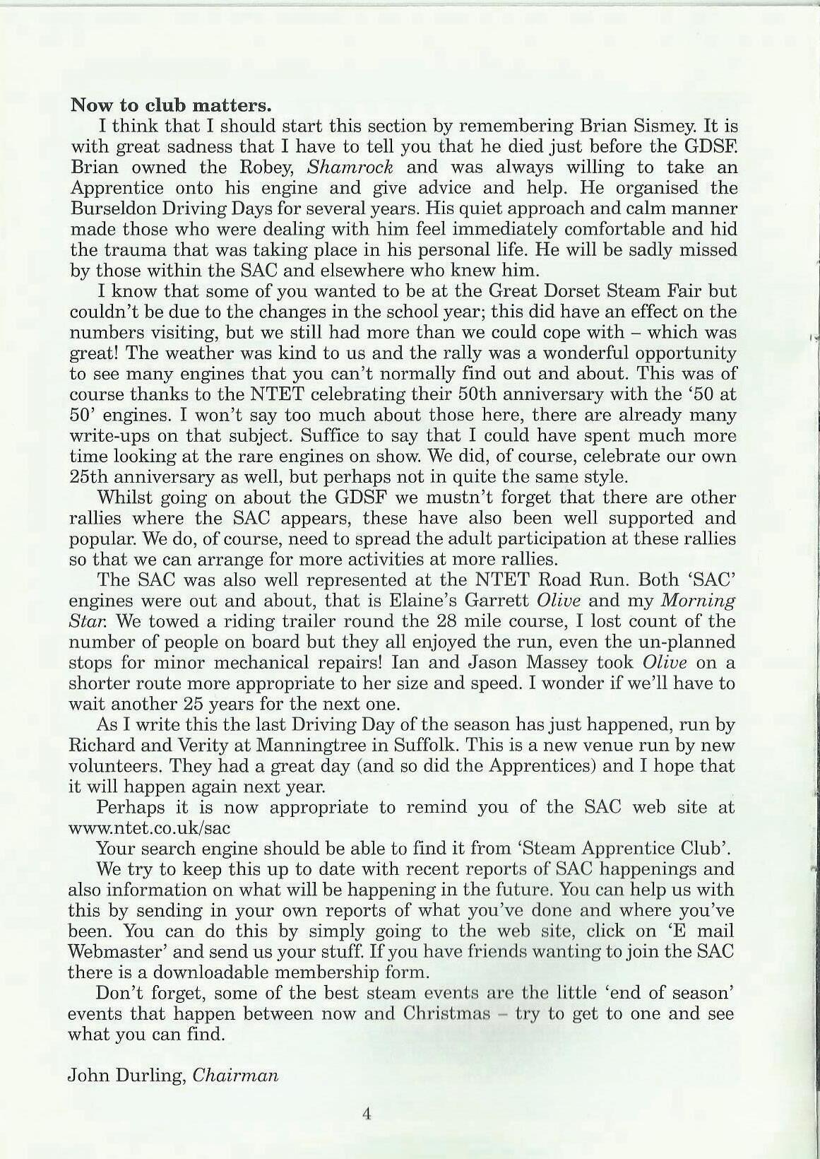 I think that I should start this section by remembering Brian Sismey. It is with great sadness that I have to tell you that he died just before the GDSF Brian owned the Robey, Shamrock and was always willing to take an Apprentice onto his engine and give advice and help. He organised the Burseldon Driving Days for several years. His quiet approach and calm manner made those who were dealing with him feel immediately comfortable and hid the trauma that was taking place in his personal life. He will be sadly missed by those within the SAC and elsewhere who knew him.
