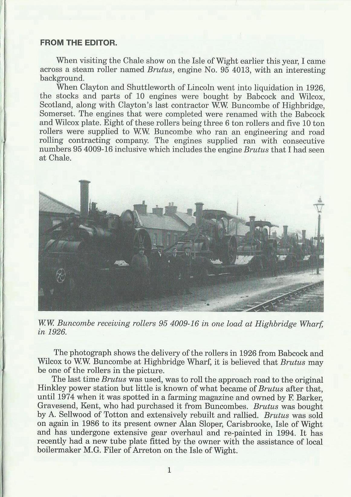 When Clayton and Shuttleworth of Lincoln went into liquidation in 1926, the stocks and parts of 10 engines were bought by Babcock and Wilcox, Scotland, along with Clayton's last contractor WW Buncombe of Highbridge, Somerset. The engines that were completed were renamed with the Babcock and Wilcox plate. Eight of these rollers being three 6 ton rollers and five 10 ton rollers were supplied to WW Buncombe who ran an engineering and road rolling contracting company. The engines supplied ran with consecutive numbers 95 4009-16 inclusive which includes the engine Brutus that I had seen at Chale.