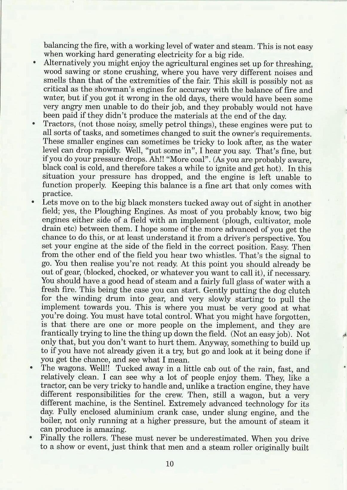 • Tractors, (not those noisy, smelly petrol things), these engines were put to all sorts of tasks, and sometimes changed to suit the owner's requirements. These smaller engines can sometimes be tricky to look after, as the water level can drop rapidly. Well, "put some in", I hear you say. That's fine, but if you do your pressure drops. Ah!! "More coal". (As you are probably aware, black coal is cold, and therefore takes a while to ignite and get hot). In this situation your pressure has dropped, and the engine is left unable to function properly. Keeping this balance is a fine art that only comes with practice.