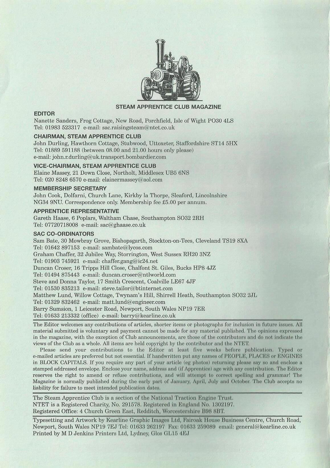 Please send your contributions to the Editor aL loaH1,J'iv1• w11olt11hnfnr1• p11hlk11tInn 'l'ypml or e-mailed articles are preferred but not essential. If hundwriU,on put 1111y111111wH or PMC>PI,M, l'I ,ACT•!Hm·lr!NC1TNT~R in BLOCK CAPITALS.If you require any part ol' your ui-Uc:ln(tig photu1-1ln1turnJ11nplt•111111Hny1-111und r•11clns1, n stamped addressed envelope. Enclose your namo, nddrnRR and (if App1·1•11f1ml 111-(1•with nny rnnf rdmf 1011.'l'ho Mdilor reserves the right to amend or ref1.1seconLribuU01111,nnd will nl,ji,111pllo tim rnrl ~,1t,l1111J.l 1111d grn111nmrl 'E'hc Magazine is normally published during the Pnrly p1u f, uf ,J111111111y, /\pill, ,luly 1111d Orf11fu1 1· 'f'lw Cluh accepLs no liability for failure to meet intended publfoaUonuul11H, The Steam Apprentice Club is a section of LhoNt1l1011ul'l'rnl'f Ju11 rn,11{ltlt1 'l'l'IIHL. NTET is a Registered Charity, No. 291678. ltogiHL(•rodin J1}ngl1111dNo. 1ao21 ~J7. Registered Office: 4 Church Green Ea1:1L,H.mldilllli,Wo,•m1Hlt11•Hl111·1•UDHHB'l', Typesetting and Artwork by Kearline Graphic Tu111g<'HUd, Ji\1troak lfouRr•Business Centre, Church Road, Newport, South Wales NP19 7EJ Tel: 0Hl:l'.l 2mn1n l1\1x: otn:tl :.!n!HJ8Uomail: general@kearline.co.uk Printed by MD Jenkins Printers Lld, Lydmiy, Cllo11<llii Ii ,tM,I