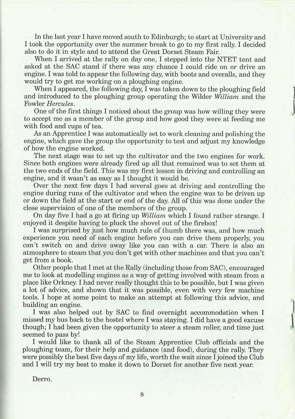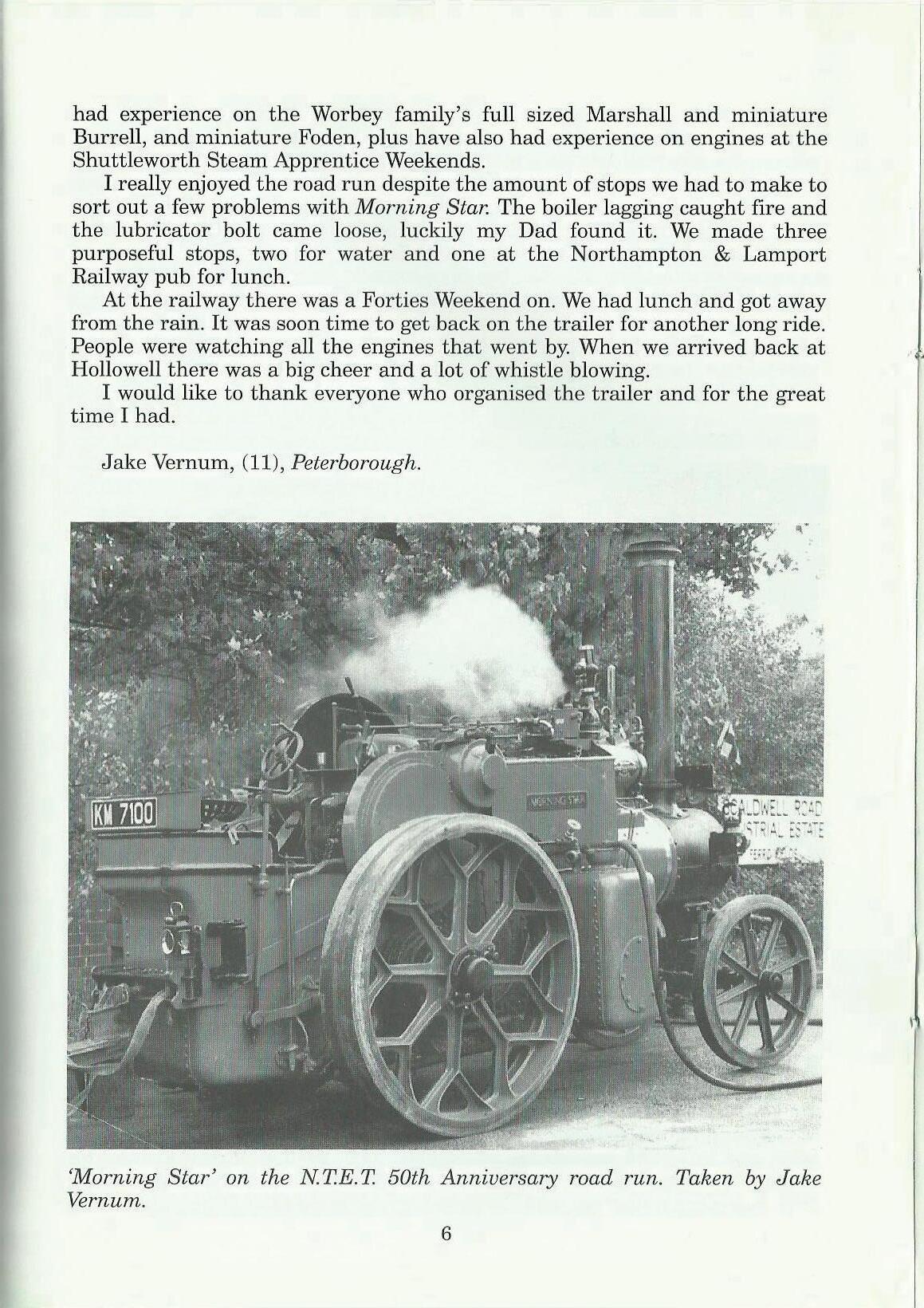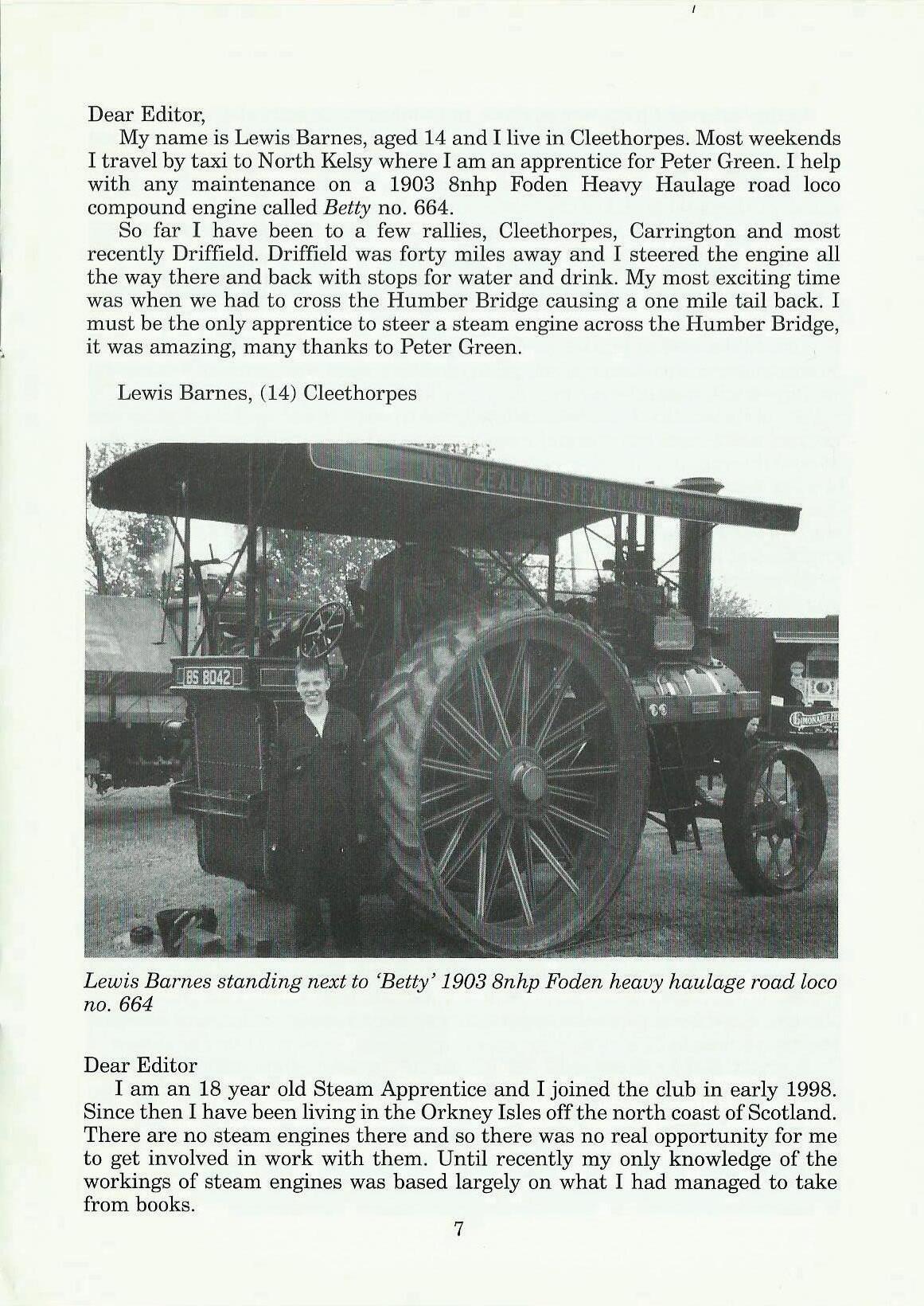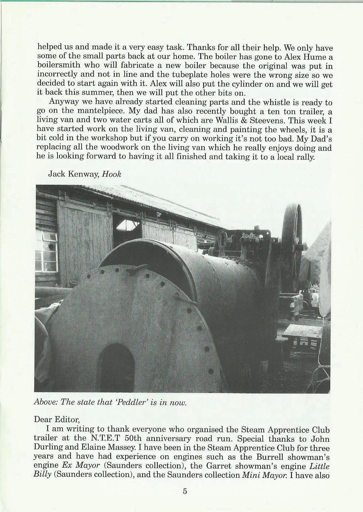 I am writing to thank everyone who organised the Steam Apprentice Club trailer at the N.T.E.T 50th anniversary road run. Special thanks to John Durling and Elaine Massey. I have been in the Steam Apprentice Club for three years and have had experience on engines such as the Burrell showman's engine Ex Mayor (Saunders collection), the Garret showman's engine Little Billy (Saunders collection), and the Saunders collection Mini Mayor. I have also