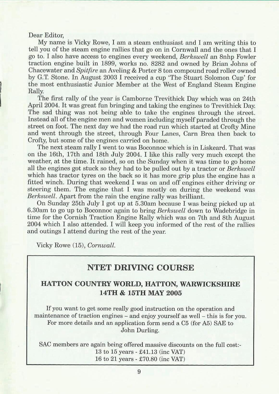 My name is Vicky Rowe, I am a steam enthusiast and I am writing this to tell you of the steam engine rallies that go on in Cornwall and the ones that I go to. I also have access to engines every weekend, Berkswell an 8nhp Fowler traction engine built in 1899, works no. 8282 and owned by Brian Johns of Chacewater and Spitfire an Aveling & Porter 8 ton compound road roller owned by G.T. Stone. In August 2003 I received a cup 'The Stuart Solomon Cup' for the most enthusiastic Junior Member at the West of England Steam Engine Rally.