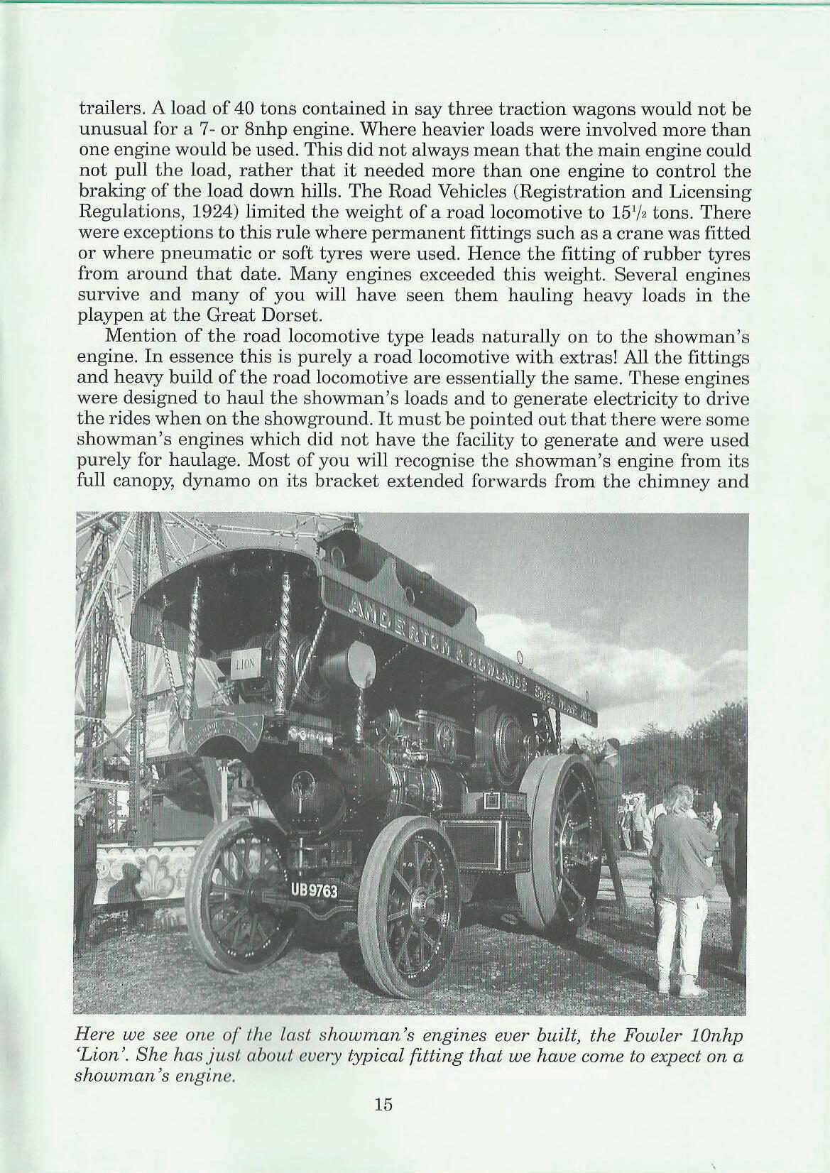 trailers. A load of 40 tons contained in say three traction wagons would not be unusual for a 7- or 8nhp engine. Where heavier loads were involved more than one engine would be used. This did not always mean that the main engine could not pull the load, rather that it needed more than one engine to control the braking of the load down hills. The Road Vehicles (Registration and Licensing Regulations, 1924) limited the weight of a road locomotive to 151/2 tons. There were exceptions to this rule where permanent fittings such as a crane was fitted or where pneumatic or son tyres were used. Hence the fitting of rubber tyres from around that date. Many engines exceeded this weight. Several engines survive and many of you will have seen them hauling heavy loads in the playpen at the Great Dorset.