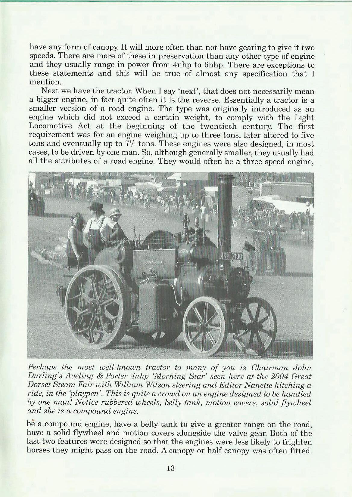 Perhaps the 1nost well-known tractor to many of you is Chairman John Durling's Aveling & Porter 4nhp 'Morning Star' seen here at the 2004 Great Dorset Steam Fair with William Wilson steering and Editor Nanette hitching a ride, in the 'playpen'. This is quite a crowd on an engine designed to be handled by one man! Notice rubbered wheels, belly tank, motion covers, solid flywheel and she is a compound engine.
