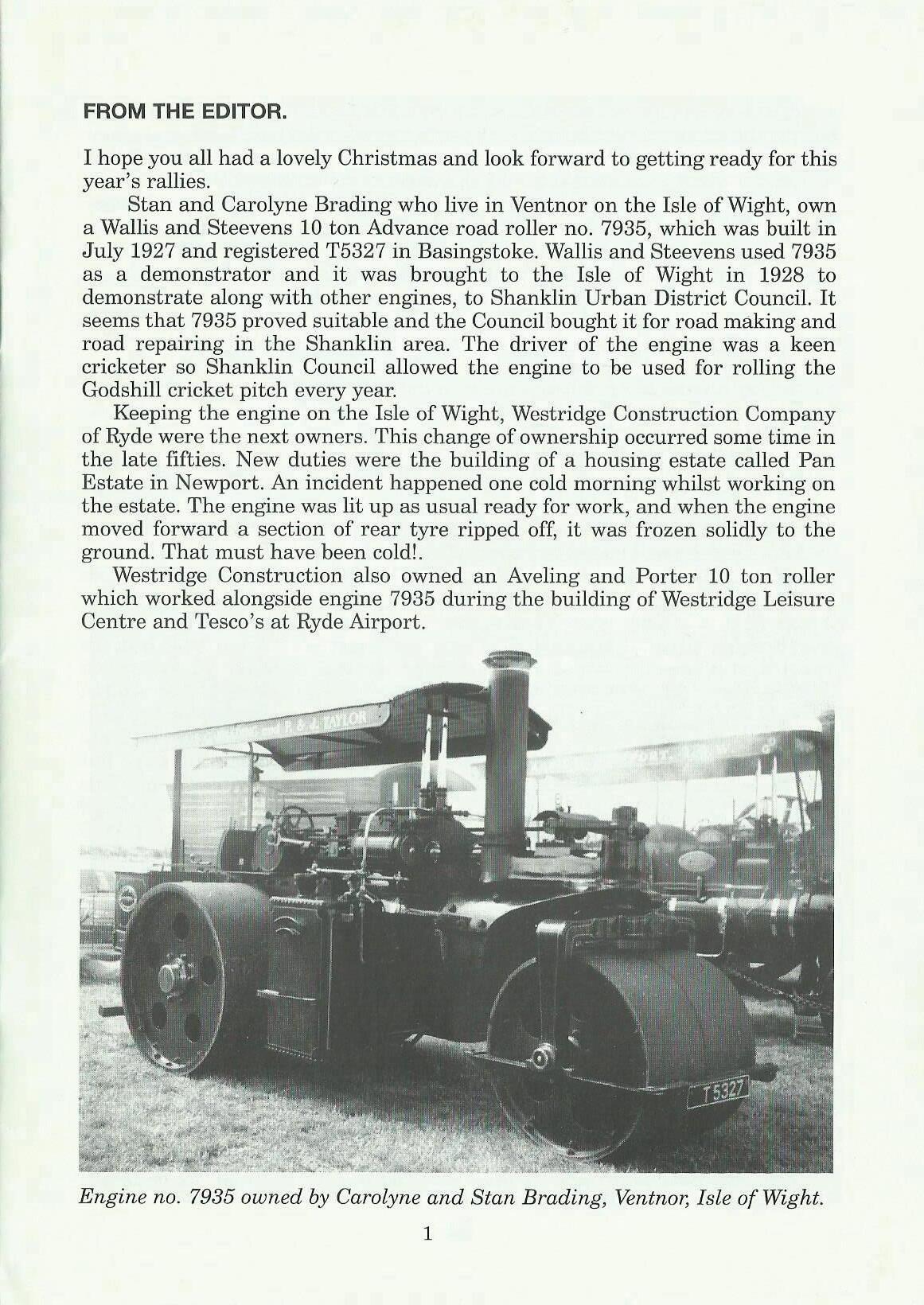Stan and Carolyne Brading who live in Ventnor on the Isle of Wight, own a Wallis and Steevens 10 ton Advance road roller no. 7935, which was built in July 1927 and registered T5327 in Basingstoke. Wallis and Steevens used 7935 as a demonstrator and it was brought to the Isle of Wight in 1928 to demonstrate along with other engines, to Shanklin Urban District Council. It seems that 7935 proved suitable and the Council bought it for road making and road repairing in the Shanklin area. The driver of the engine was a keen cricketer so Shanklin Council allowed the engine to be used for rolling the Godshill cricket pitch every year.