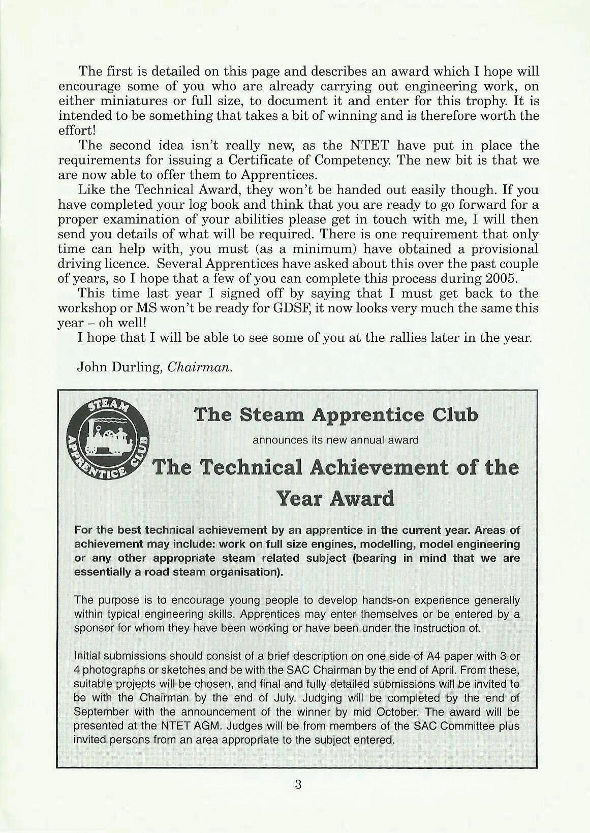 For the best technical achievement by an apprentice in the current year. Areas of achievement may include: work on full size engines, modelling, model engineering or any other appropriate steam related subject (bearing in mind that we are essentially a road steam organisation).