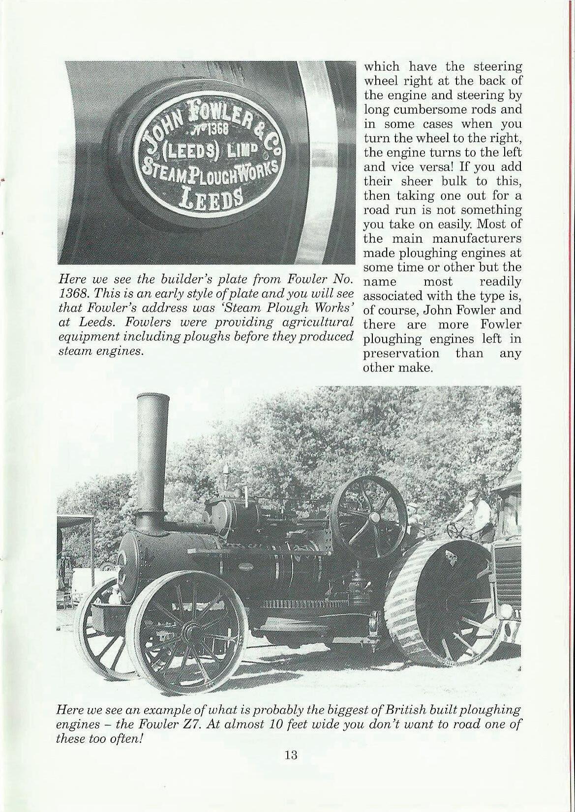 which have the steering wheel right at the back of the engine and steering by long cumbersome rods and in some cases when you turn the wheel to the right, the engine turns to the left and vice versa! If you add their sheer bulk to this, then taking one out for a road run is not s01nething you take on easily. Most of the main manufacturers made ploughing engines at some time or other but the name most readily associated with the type is, of course, John Fowler and there are more Fowler ploughing engines left in preservation than any other make.