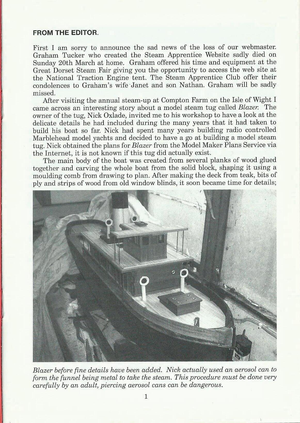 First I am sorry to announce the sad news of the loss of our webmaster. Graham Tucker who created the Steam Apprentice Website sadly died on Sunday 20th March at home. Graham offered his time and equipment at the Great Dorset Steam Fair giving you the opportunity to access the web site at the National Traction Engine tent. The Steam Apprentice Club offer their condolences to Graham's wife ·Janet and son Nathan. Graham will be sadly missed.