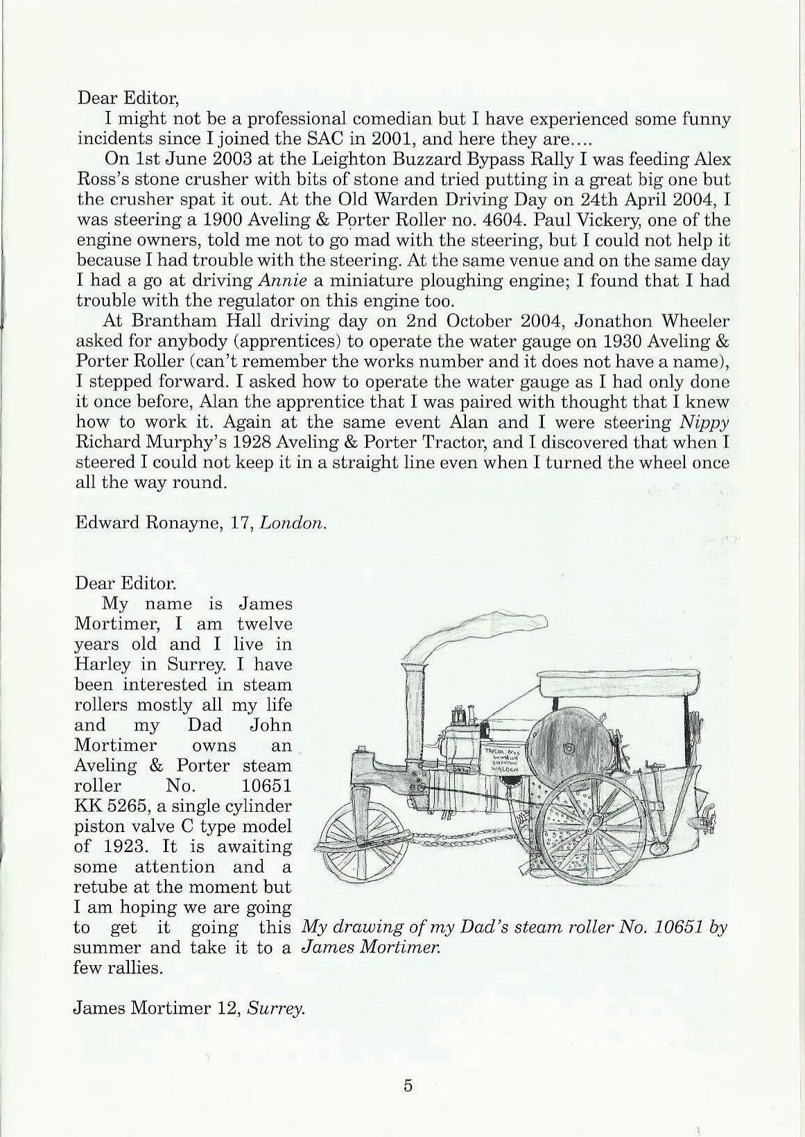 My name is James Mortimer, I am twelve years old and I live in Harley in Surrey. I have been interested in steam rollers mostly all my life and my Dad John Mortimer owns an Aveling & Porter steain roller No. 10651 KK 5265, a single cylinder piston valve C type model of 1923. It is awaiting some attention and a retube at the moment but I am hoping we are going to get it going this My drawing of my Dad's steam roller No. 10651 by summer and take it to a James Mortimer. few rallies.