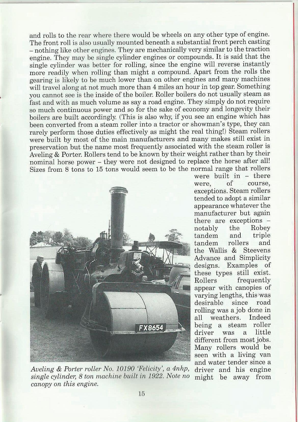 and rolls to the rear where there would be wheels on any other type of engine. The front roll is also usually mounted beneath a substantial front perch casting - nothing like other engines. They are mechanically very similar to the traction engine. They 1nay be single cylinder engines or compounds. It is said that the single cylinder was better for rolling, since the engine will reverse instantly more readily when rolling than might a compound. Apart from the rolls the gearing is likely to be 1nuch lower than on other engines and many machines will travel along at not much more than 4 miles an hour in top gear. Something you cannot see is the inside of the boiler. Roller boilers do not usually steam as fast and with as much volume as say a road engine. They simply do not require so much continuous power and so for the sake of economy and longevity their boilers are built accordingly. (This is also why, if you see an engine which has been converted from a steam roller into a tractor or showman's type, they can rarely perform those duties effectively as might the real thing!) Steam rollers were built by most of the main manufacturers and 1nany makes still exist in preservation but the name most frequently associated with the steam roller is Aveling & Porter. Rollers tend to be known by their weight rather than by their nominal horse power - they were not designed to replace the horse after all! Sizes from 8 tons to 15 tons would seem to be the normal range that rollers were built in - there were, of course, exceptions. Steam rollers tended to adopt a similar appearance whatever the manufacturer but again there are exceptionsnotably the Robey tandem and triple tandem rollers and the Wallis & Steevens Advance and Simplicity designs. Examples of these types still exist.