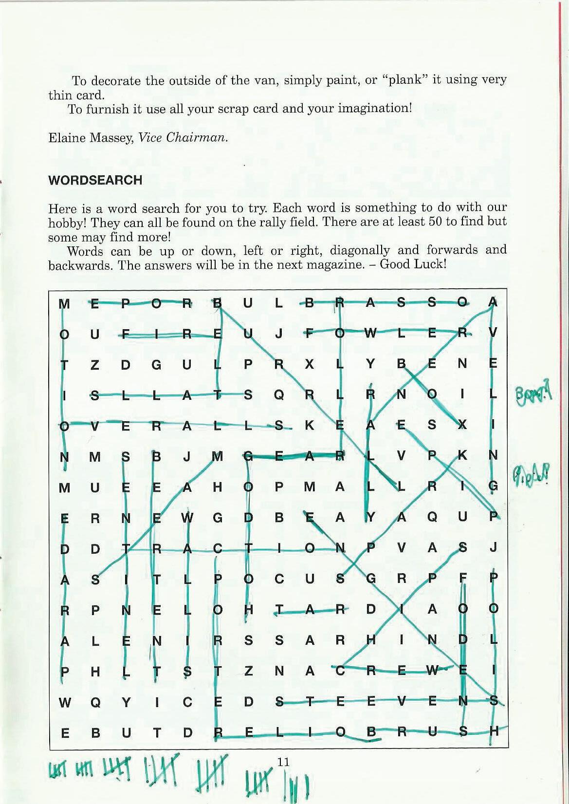 Here is a word search for you to try. Each word is something to do with our hobby! They can all be found on the rally field. There are at least 50 to find but some may find more!