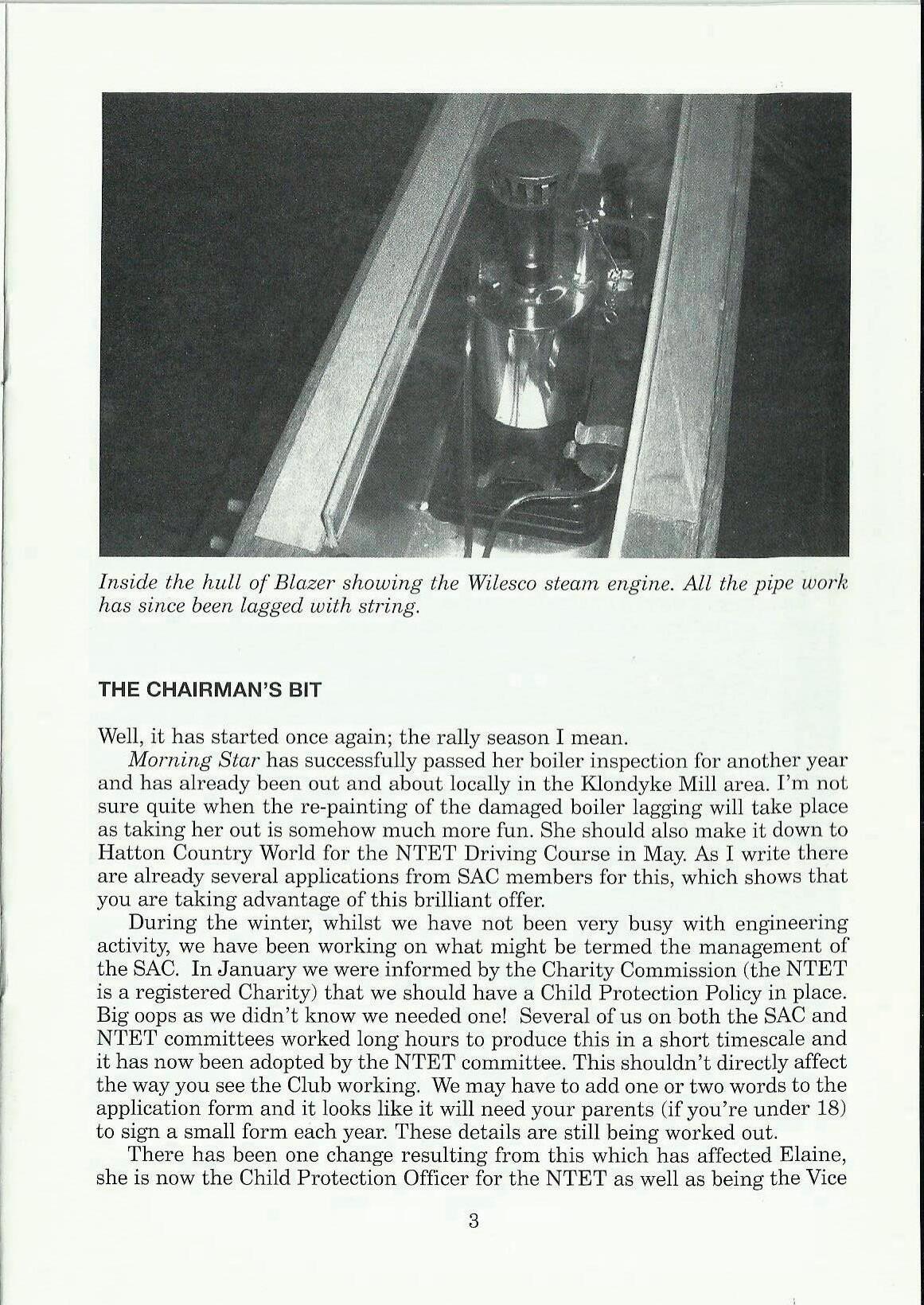 During the winter, whilst we have not been very busy with engineering activity, we have been working on what might be tenned the management of the SAC. In January we were infonned by the Charity Com1nission (the NTET is a registered Charity) that we should have a Child Protection Policy in place. Big oops as we didn't know we needed one! Several of us on both the SAC and NTET committees worked long hours to produce this in a short timescale and it has now been adopted by the NTET committee. This shouldn't directly affect the way you see the Club working. We may have to add one or two words to the application fonn and it looks like it will need your parents (if you're under 18) to sign a small form each year. These details are still being worked out.