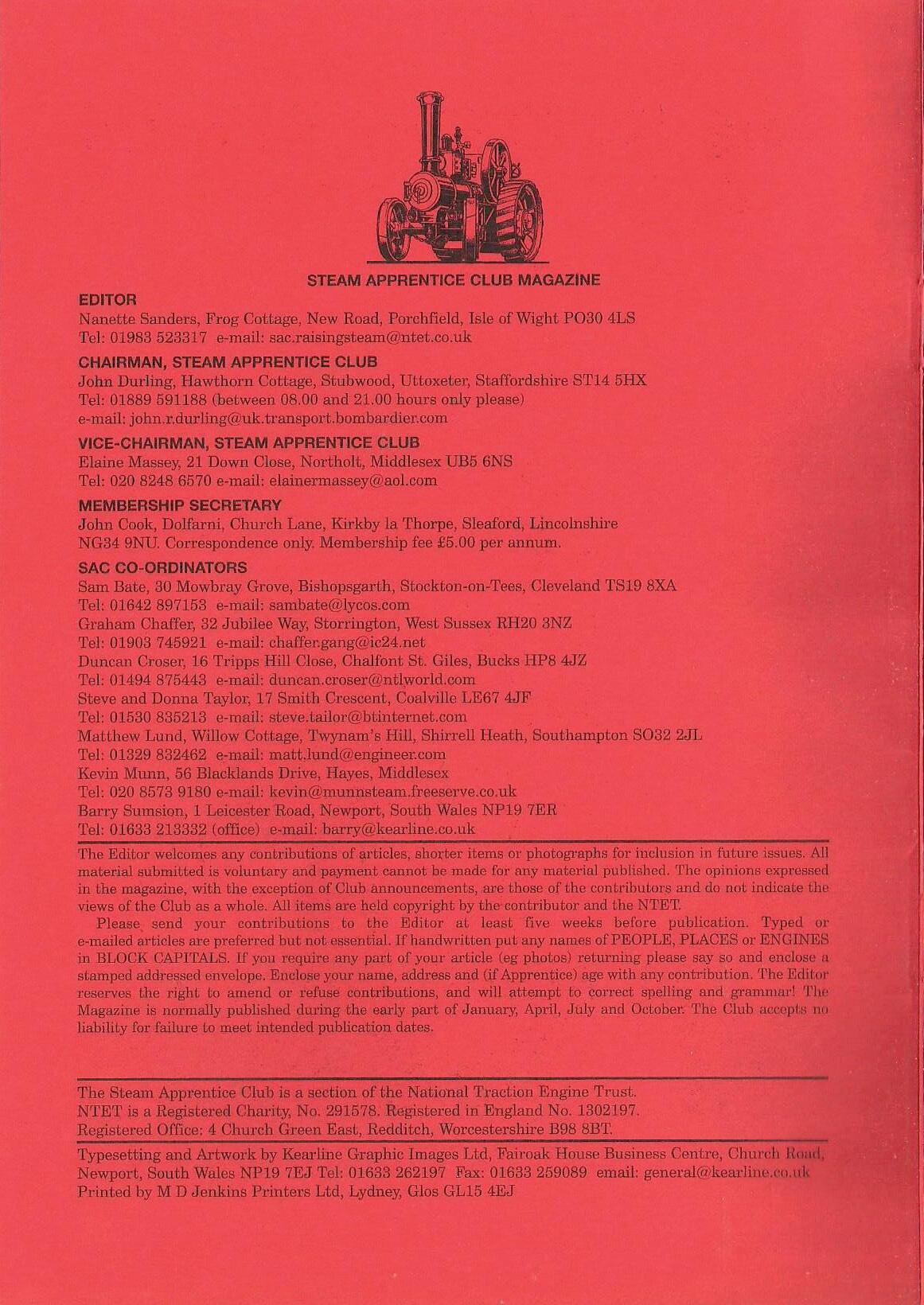 Please send your contributions to the Editor at least fiVe weeks before publication. Typed or e-mailed ~rticles are preferred but notessendai. If handwritten put any names of PEOPLE, PLACES or ENGINES in BLOCK CAPITALS.If:vou require any part of your article (eg.photos) returning please say so and enclose n stamped addressed envelope. Enclose your name, address and (if Apprentice) age with any contribution. The Edi1:ol' reserves the right to amend or refuse" cont).'ibutions, and will attempt r.o Correct spelling and grammar! 'l'lt(• Magazine is normally published during the early part of January, April, July and October. The C!ub accepl,s mi liability for failure to meet intended publication dates.