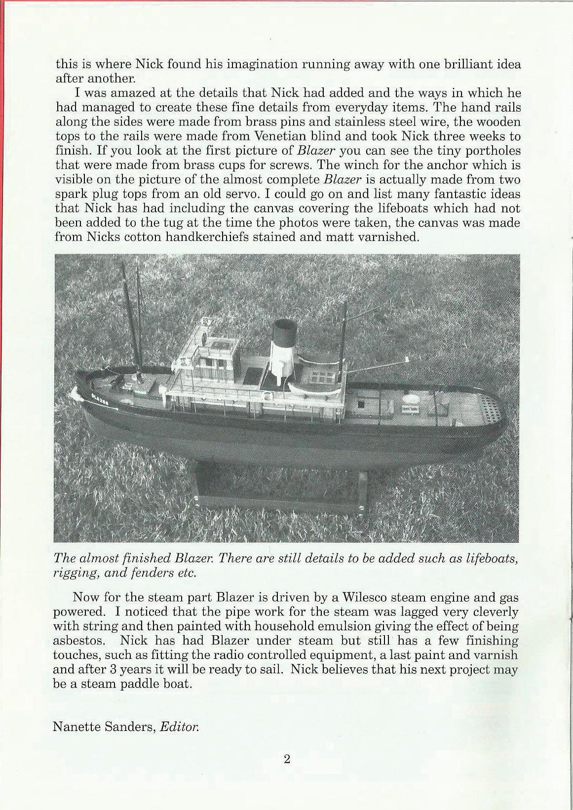I was amazed at the details that Nick had added and the ways in which he had managed to create these fine details fr01n everyday items. The hand rails along the sides were made from brass pins and stainless steel wire, the wooden tops to the rails were made from Venetian blind and took Nick three weeks to finish. If you look at the first picture of Blazer you can see the tiny portholes that were made from brass cups for screws. The winch for the anchor which is visible on the picture of the almost complete Blazer is actually made from two spark plug tops from an old servo. I could go on and list many fantastic ideas that Nick has had including the canvas covering the lifeboats which had not been added to the tug at the time the photos were taken, the canvas was made fr01n Nicks cotton handkerchiefs stained and matt varnished.