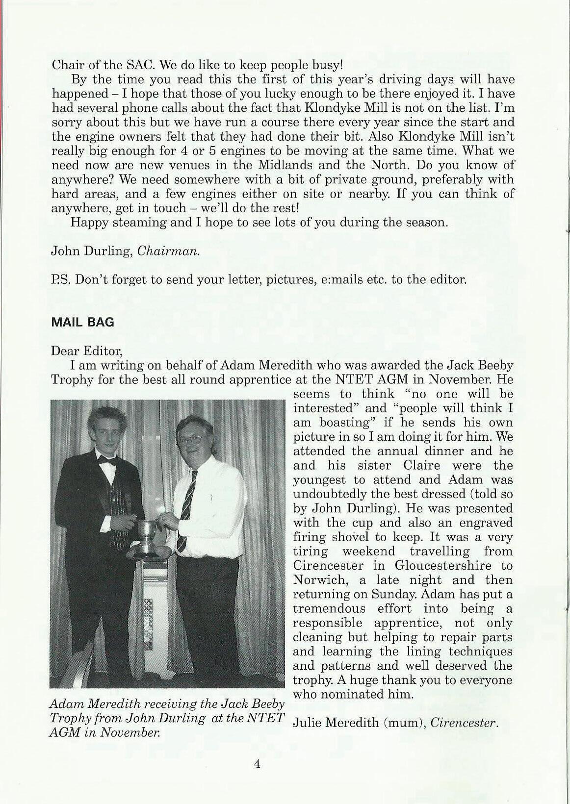 I am writing on behalf of Adam Meredith who was awarded the Jack Beeby Trophy for the best all round apprentice at the NTET AGM in November. He