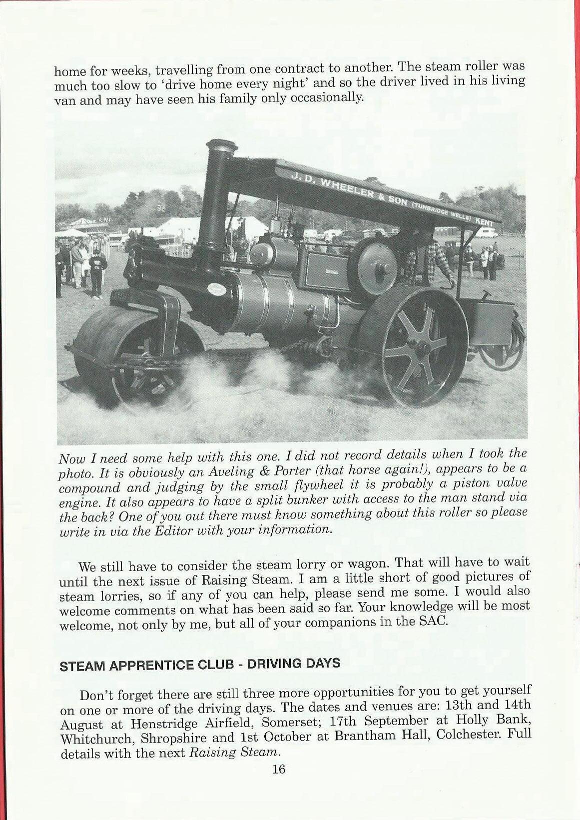 We still have to consider the steam lorry or wagon. That will have to wait until the next issue of Raising Steam. I am a little short of good pictures of steam lorries, so if any of you can help, please send me some. I would also welcome comments on what has been said so far. Your knowledge will be most welcome, not only by me, but all of your companions in the SAC.