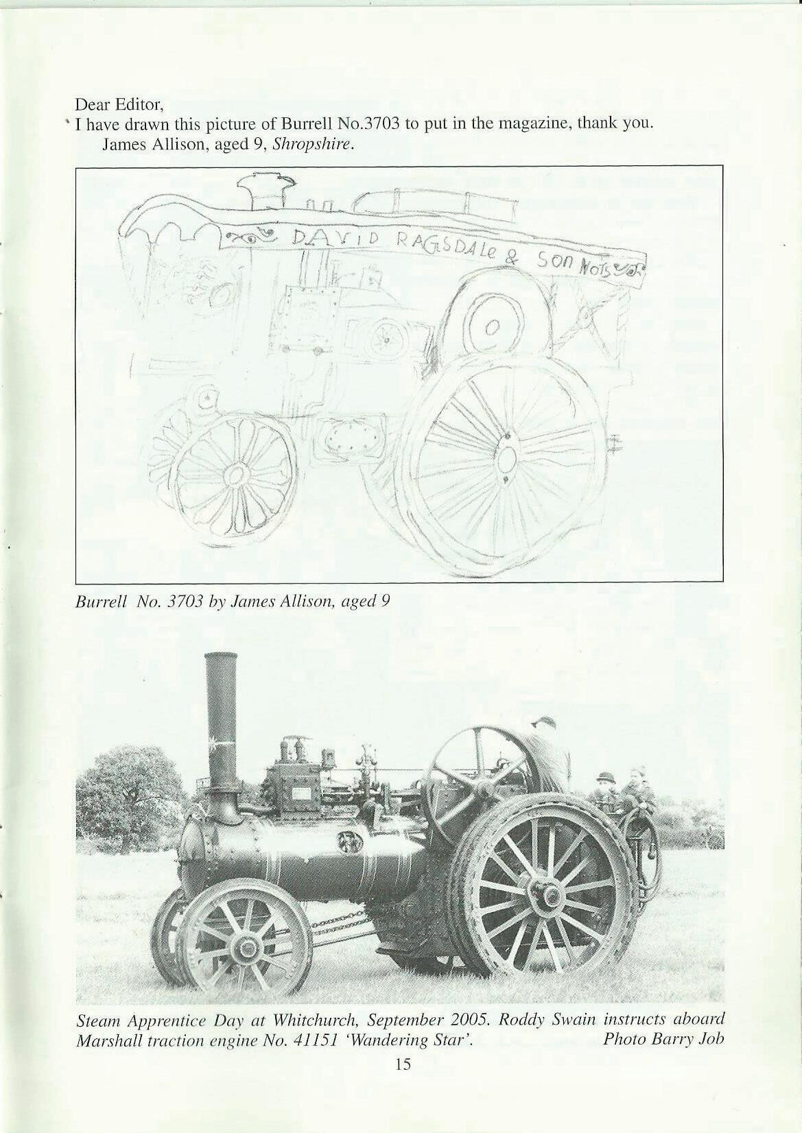 Dear Editor, I have drawn this picture of Burrell No.3703 to put in the magazine, thank you. James Allison, aged 9, Shropshire.