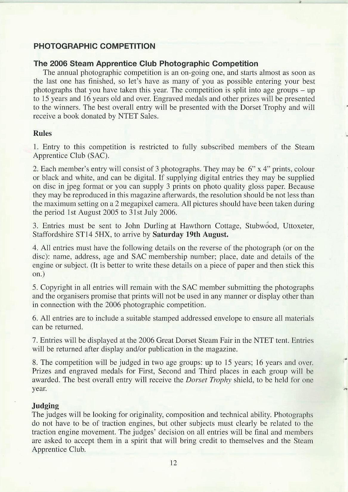 7. Entries will be displayed at the 2006 Great Dorset Steam Fair in the NTET tent. Entries will be returned after display and/or publication in the magazine.