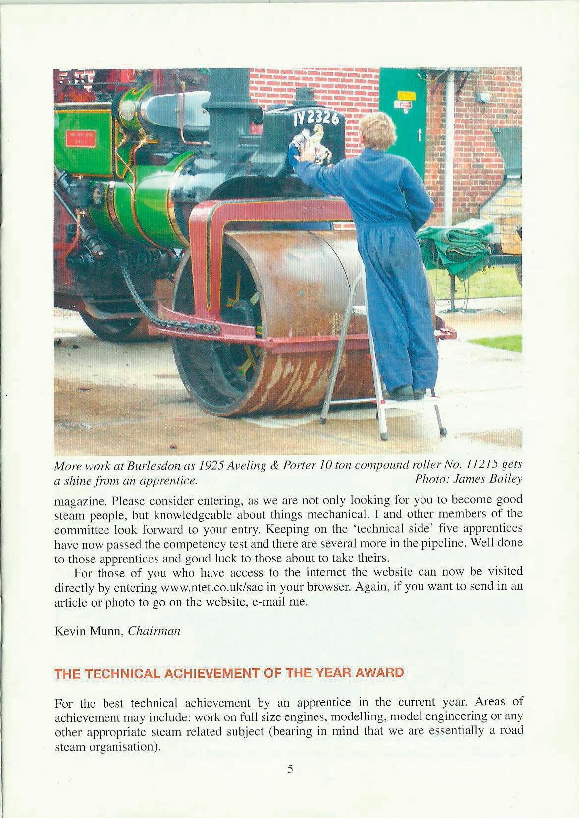 For the best technical achievement by an apprentice in the current year. Areas of achievement may include: work on full size engines, modelling, mode1 engineering or any other appropriate steam related subject (bearing in mind that we are essentially a road stearn organisation).