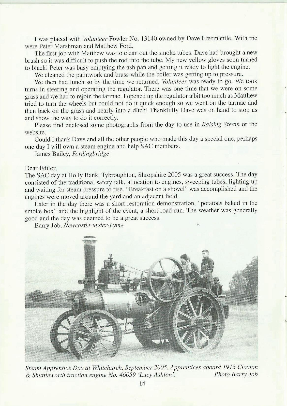 More work at Burlesdon as 1925 Ave ling & Porter I O ton compound roller No. 11215 gets a shine from an apprentice. Photo: James Bailey magazine. Please consider entering, as we are not only looking for you to become good steam peop1e, but knowledgeable about things mechanical. I and other members of the committee 1ook forward to your entry. Keeping on the 'technical side' five apprentices have now passed the competency test and there are several more in the pipeline. Well done to those apprentices and good luck to those about to take theirs.