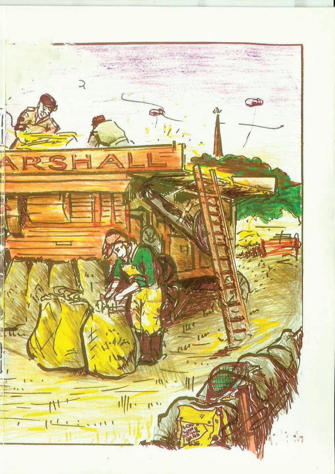 On the previous two pages we reproduce the winning entry from the over 12s. This is by Faye Lane and it is doubtful if our p1inting methods can do justice to the wonderful job Faye made of her entry. Not only has Faye used a variety of colouring media to enhance her work but she has added extra detail and portrays a scene from World War II showing 'Land Girls' at work. Notice helmets, gas mask container and air balloons, all to help protect the 'girls' from enemy aircraft attack.