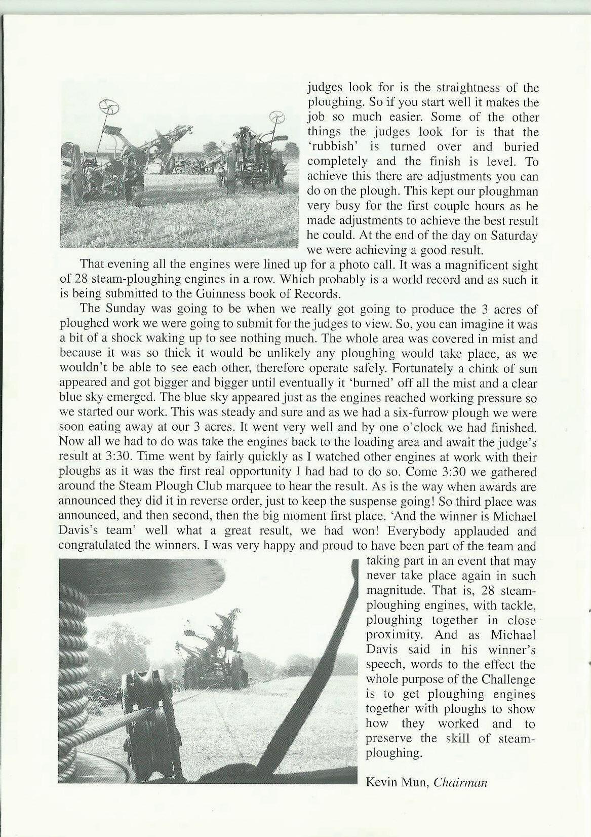 The Sunday was going to be when we really got going to produce the 3 acres of ploughed work we were going to submit for the judges to view. So, you can imagine it was a bit of a shock waking up to see nothing much. The whole area was covered in mist and because it was so thick it would be unlikely any ploughing would take place, as we wouldn't be able to see each other, therefore operate safely. Fortunately a chink of sun appeared and got bigger and bigger until eventually it 'burned' off all the mist and a clear blue sky emerged. The blue sky appeared just as the engines reached working pressure so we started our work. This was steady and sure and as we had a six-furrow plough we were soon eating away at our 3 acres. It went very well and by one o'clock we had finished. Now all we had to do was take the engines back to the loading area and await the judge's result at 3:30. Time went by fairly quickly as 1 watched other engines at work with their ploughs as it was the first real opportunity l had had to do so. Come 3:30 we gathered around the Steam Plough Club marquee to hear the result. As is the way when awards are aru,ouncecl they did it in reverse order, just to keep the suspense gojngl So third place was announced, and then second, then the big moment first place. 'And the winner is Michael Davis 's team' well what a great result, we had won! Everybody applauded and congratulated the winners. I was very happy and proud to have been part of the team and taking part in an event that may never take place again in such magnitude. That is, 28 steamploughing engines, with tackle, ploughing together in close proximity. And as Michael Davis said in his winner's speech, words to the effect the whole purpose of the Challenge is to get ploughing engines together with ploughs to show how they worked and to preserve the skill of steamploughing.