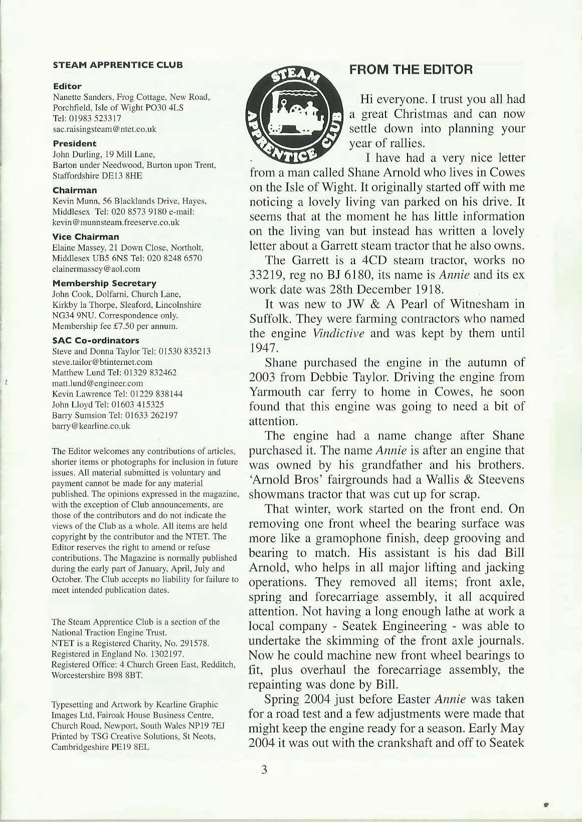 The Stearn Apprentice Club is a section of tl1c National Traction Engine Trust. NTET is a Registered Charity, No. 291578. Registered in England No. 1302197. Registered Office: 4 Church Green East, Redditcb, Worcestershire B98 8BT.