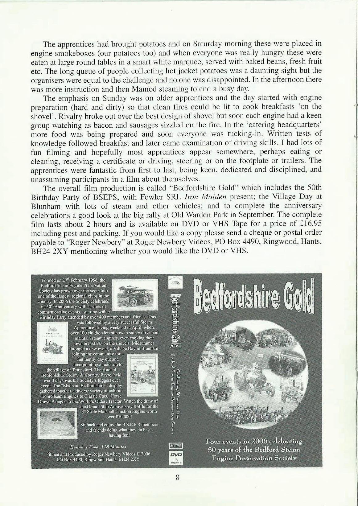The overall film production is called "Bedfordshire Gold" which includes the 50th Birthday Party of BSEPS, with Fowler SRL Iron Maiden present; the Village Day at Blunham with lots of steam and other vehicles; and to complete the anniversary celebrations a good look at the big ra1lyat Old Warden Park in September. The complete film lasts about 2 hours and is available on DVD or VHS Tape for a price of £16.95 including post and packing. If you would like a copy please send a cheque or postal order payable to "Roger Newbery" at Roger Newbery Videos, PO Box 4490, Ringwood, Hants. BH24 2XY 111.entioningwhether you would like the DVD or VHS.