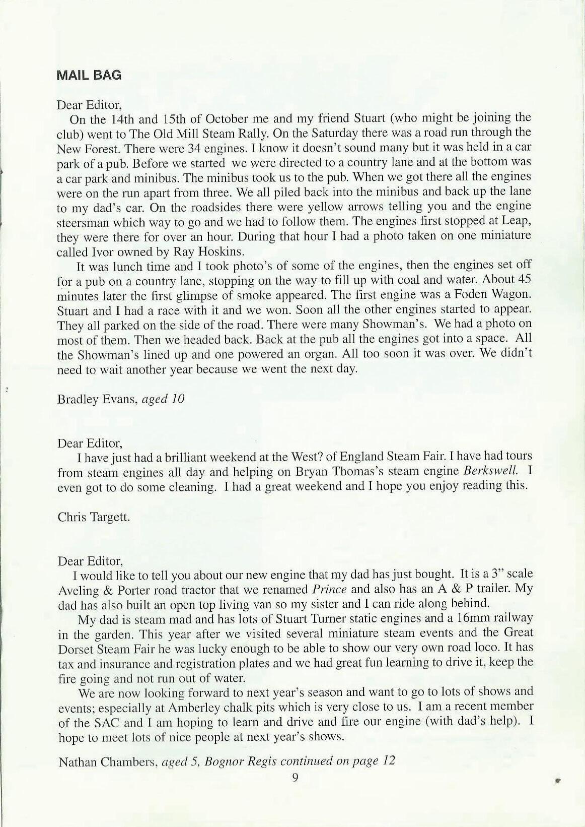 On the 14th and 15th of October me and my friend Stuart (who n1_jghtbe joining the club) went to The Old Mill Steam Rally. On the Saturday there was a road run through the New Forest. There were 34 engines. l know it doesn't sound many but it was held in a car park of a pub. Before we started we were direcled to a country lane and at the bottom was a car park and minibus. The minibus took us to the pub. When we got there all the engines were on the run apart from three. We all piJed back into the minibus and back up the lane to my dad's car. On the roadsides there were yellow arrows telling you and the engine steersman which way to go and we had to follow them. The engines first stopped at Leap, they were there for over an hour. During that hour I had a photo taken on one miniature called Ivor owned by Ray Hoskins.