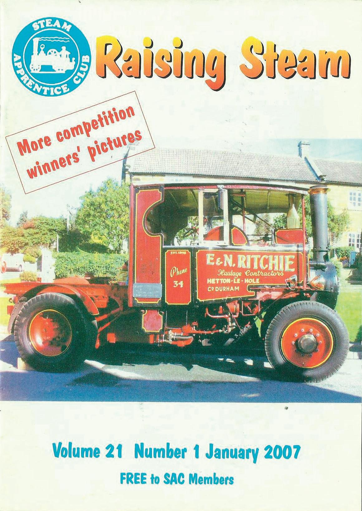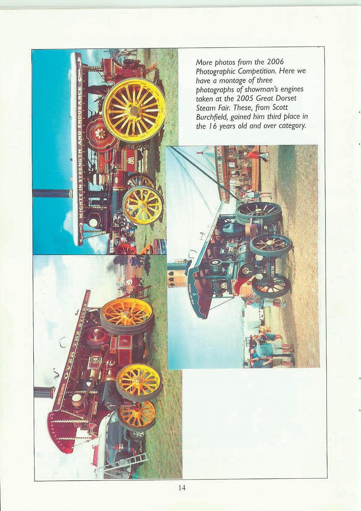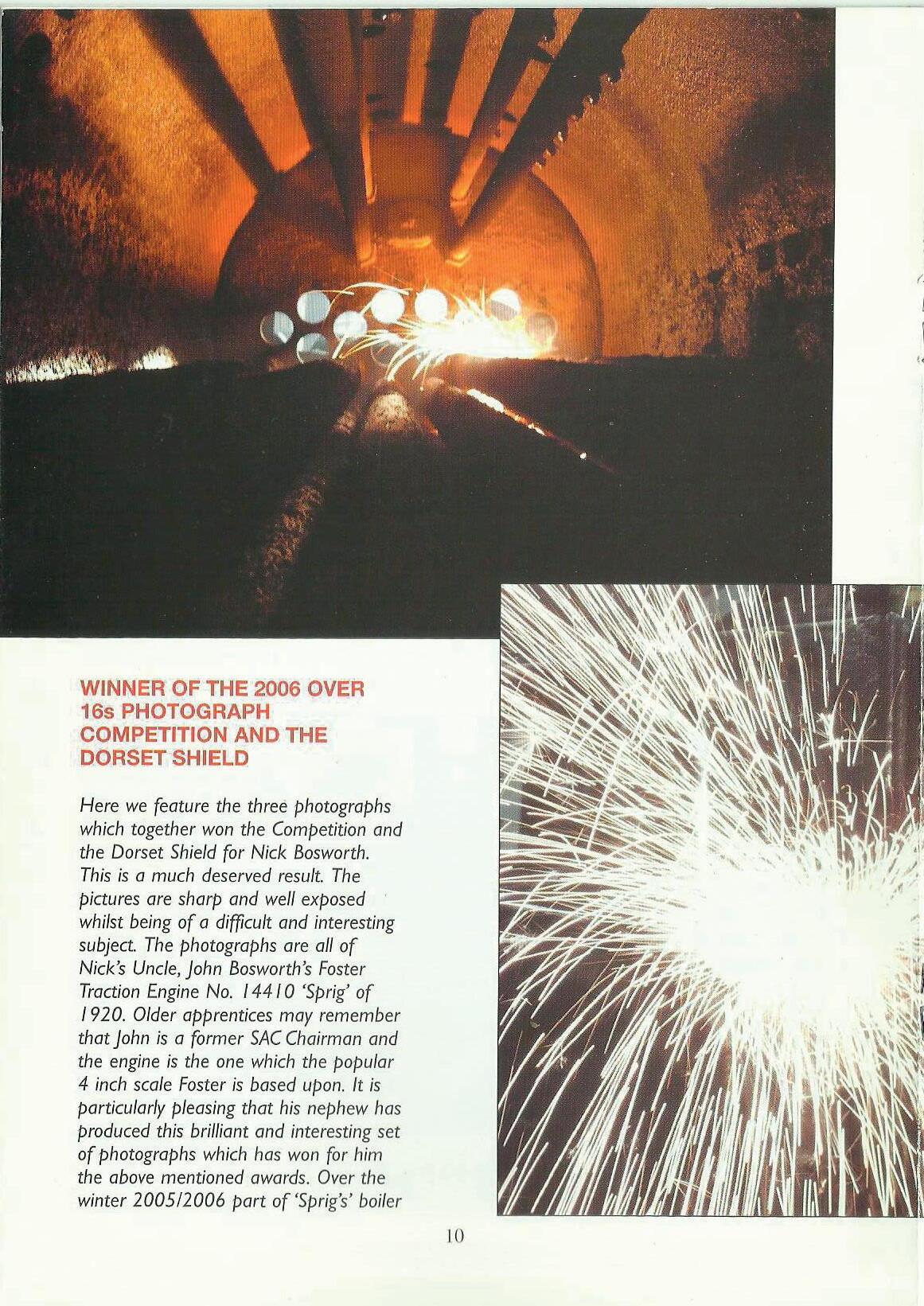 Here we feature the three photographs which together won the Competitionand the Dorset Shieldfor Nick Bosworth. This is a much deserved result.The pictures are sharp and well exposed • whilst being of a difficultand interesting subject. The photographsare all of Nick's Uncle,John Bosworth'sFoster TractionEngineNo. 14410 'Sprig'of I 920. Older apprenticesmay remember that John is a former SACChairmanand the engine is the one which the popular 4 inch scale Fosteris based upon. It is particularlypleasingthat his nephew has producedthis brilliantand interestingset of photographswhich has won for him the above mentioned awards.Over the winter 2005/2006 part of 'Sprig's'boiler