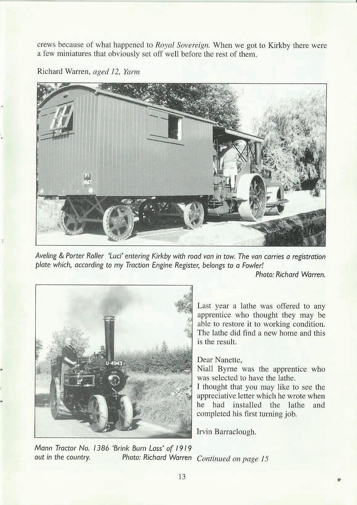 I would like to tell you about our new engine that my dad has just bought. It is a 3" scale Aveling & Porter road tractor that we renamed Prince and also has an A & P trailer. My dad has also built an open top living van so my sister and I can ride along behind. My dad is steam mad and has lots of Stuart Turner static engines and a 16mm railway in the garden. This year after we visited several miniature steam events and the Great Dorset Steam Fair he was lucky enough to be able to show our very own road loco. It has tax and insurance and registration plates and we had great fun learning to drive it, keep the fire going and not run out of water.
