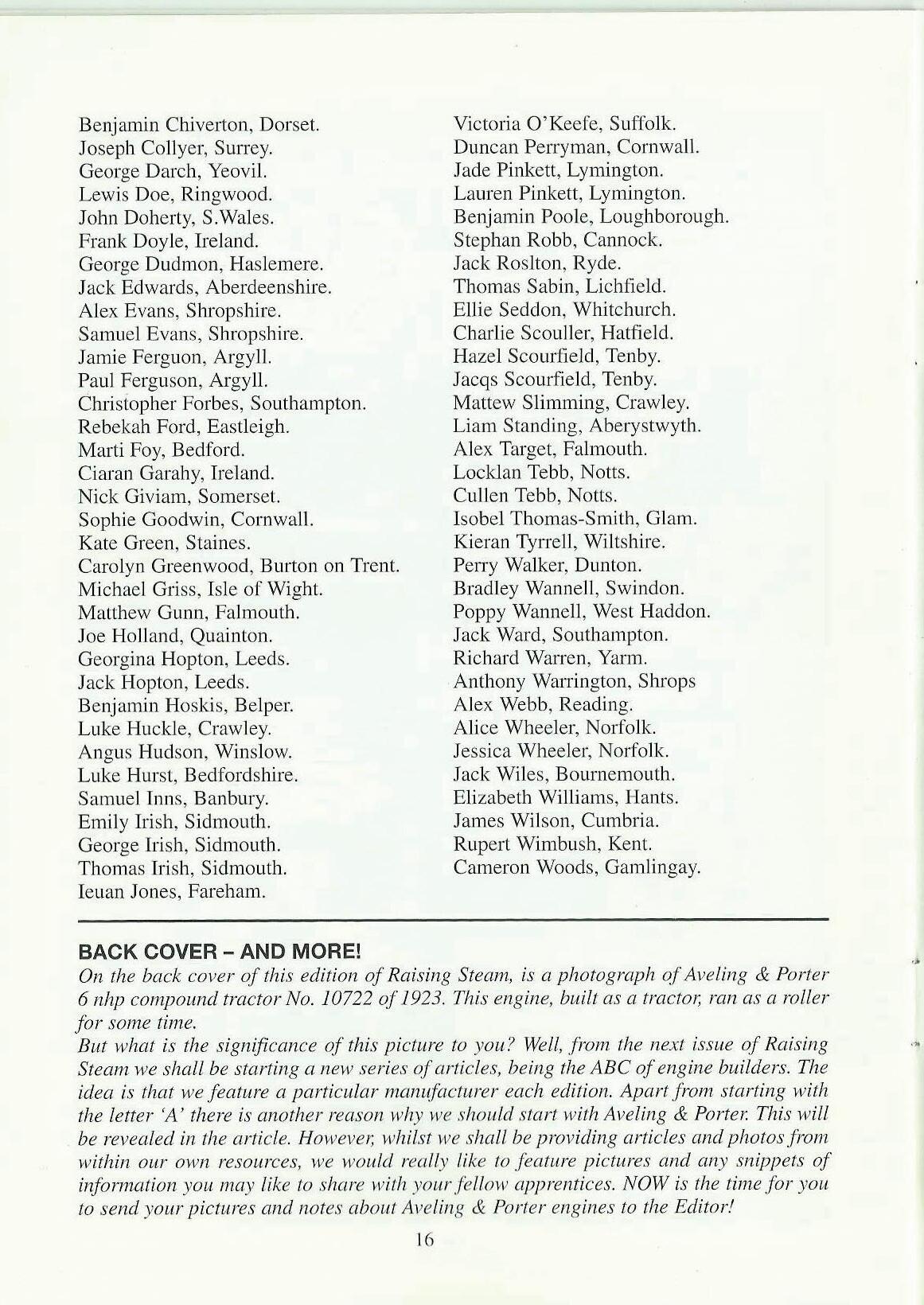 But what is the significance of this picture to you? Well, from the next issue of Raising ,,. Steam 1--veshall be starting a new series of articles, being the ABC of engine builders. The idea is that we feature a particular mani{facturer each edition. Apart from starting with the letter 'A' there is another reason why we should start with Aveling & Porter. This will be revealed in the article. Howeve1; whilst we shall be providing articles and photosfj-0111. within our own resources, we would really like to feature pictures and any snippets of information you may like to share with your fellow apprentices. NOW is the time for you to send your pictures and notes about Aveling & Porter engines to the Editor.'