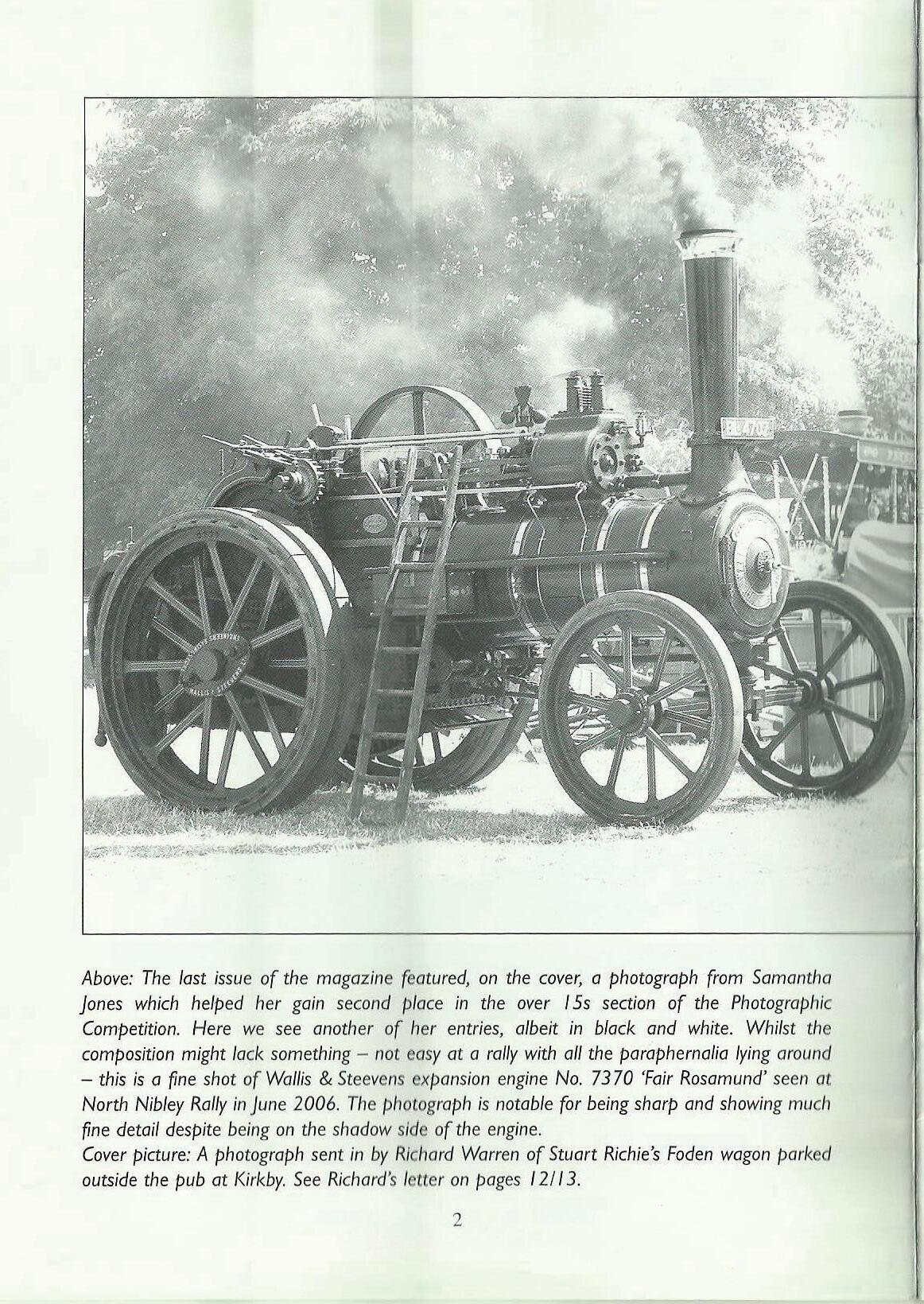 Above: The last issue of the magazine featured, on the cover, a photograph from Samantha Jones which helped her gain second place in the over I5s section of the Photographic Competition. Here we see another of her entries, albeit in black and white. Whilst the composition might lack something - not easy at a rally with all the paraphernalia lying around - this is a fine shot of Wallis & Steevensexpansion engine No. 73 70 'Fair Rosamund' seen at North Nibley Rally in June 2006. The photograph is notable for being sharp and showing much fine detail despite being on the shadow side of the engine.